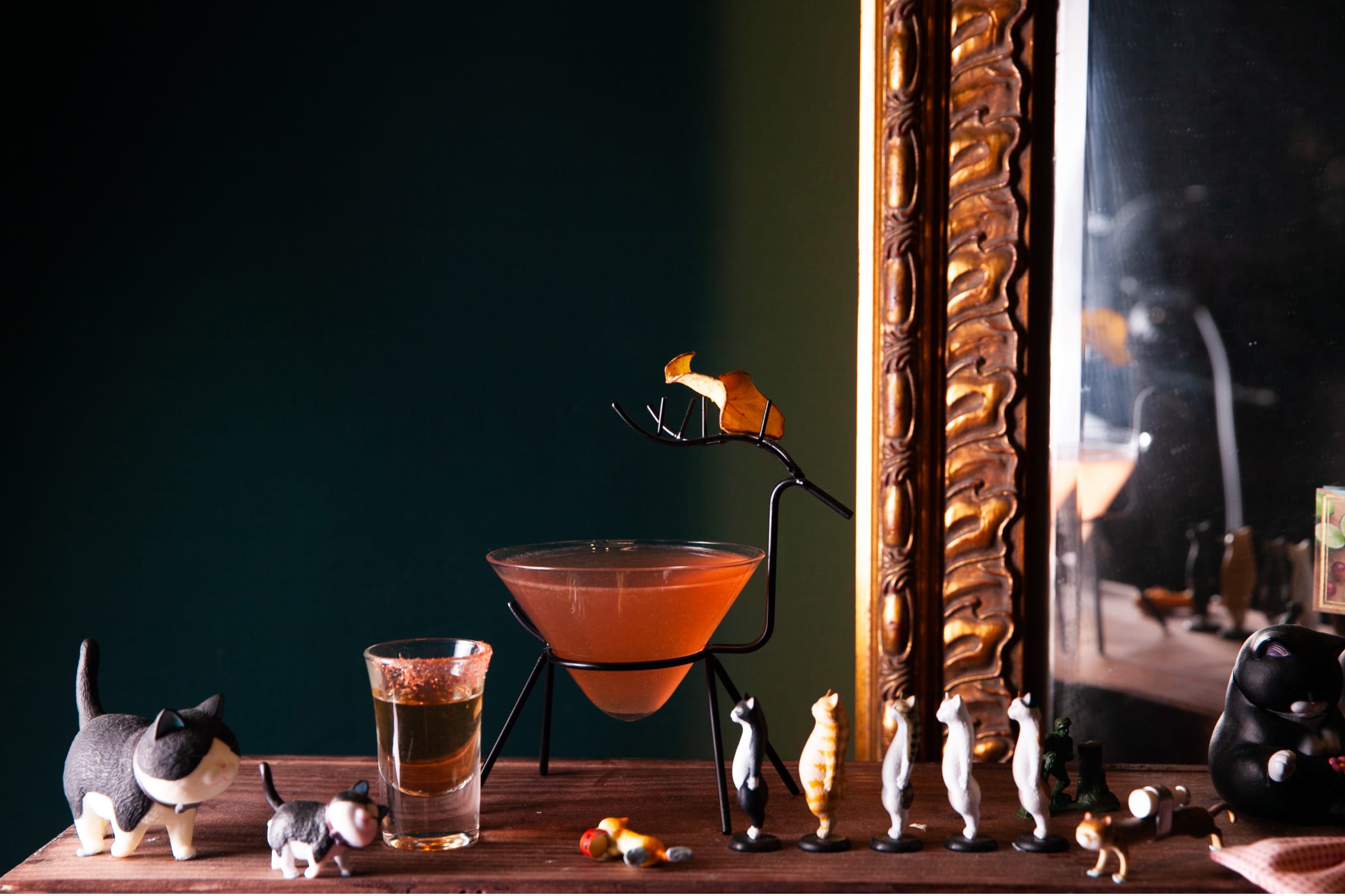 來到派對跑趴肯定要有香檳助興呀!「香檳禮帽」使用紫蘇梅、白酒以秘魯白蘭地製作,呈現粉紅色微氣泡的香檳口感,清爽的口感下帶著小惡魔的後勁,猶如Disco年代流行的粉紅黛仙,如此甜美宜人~