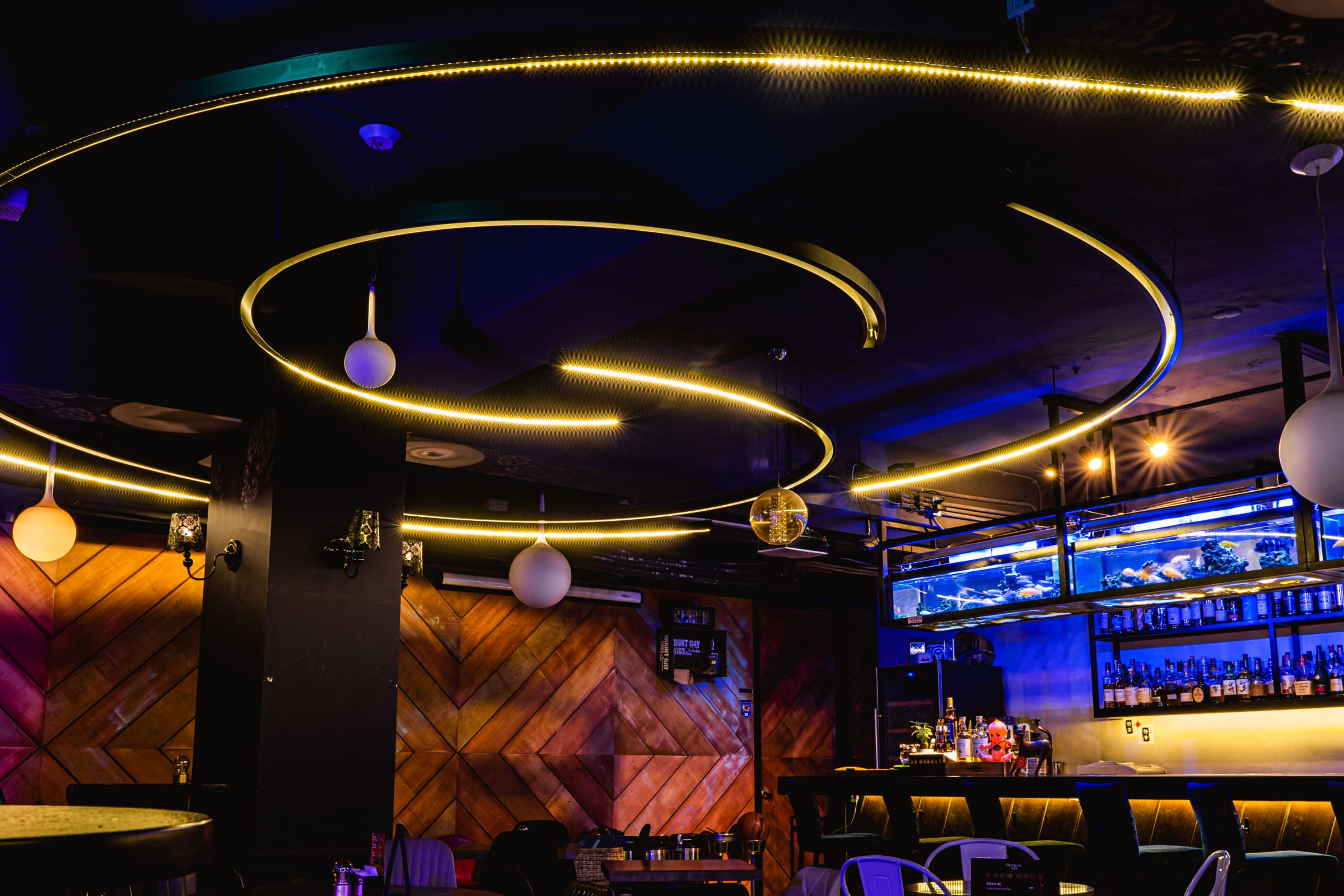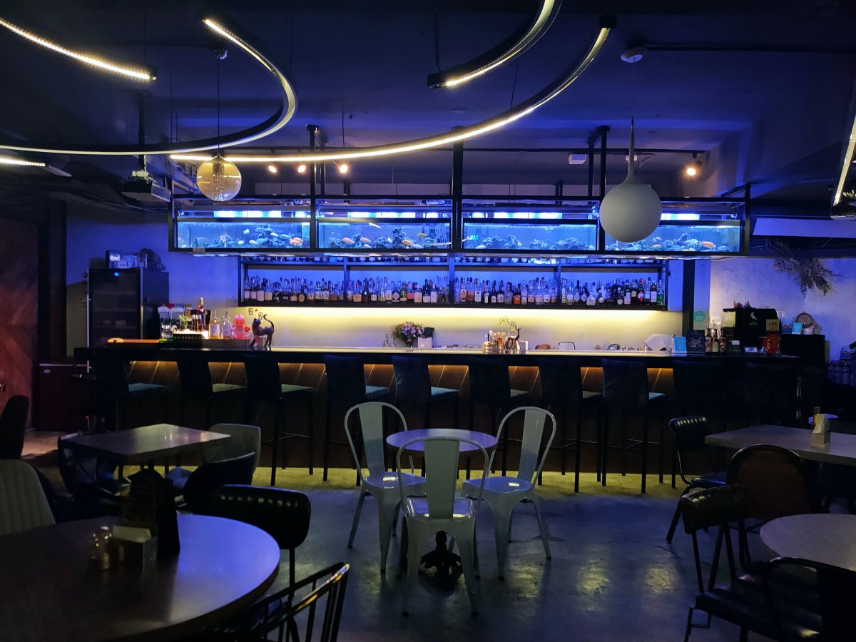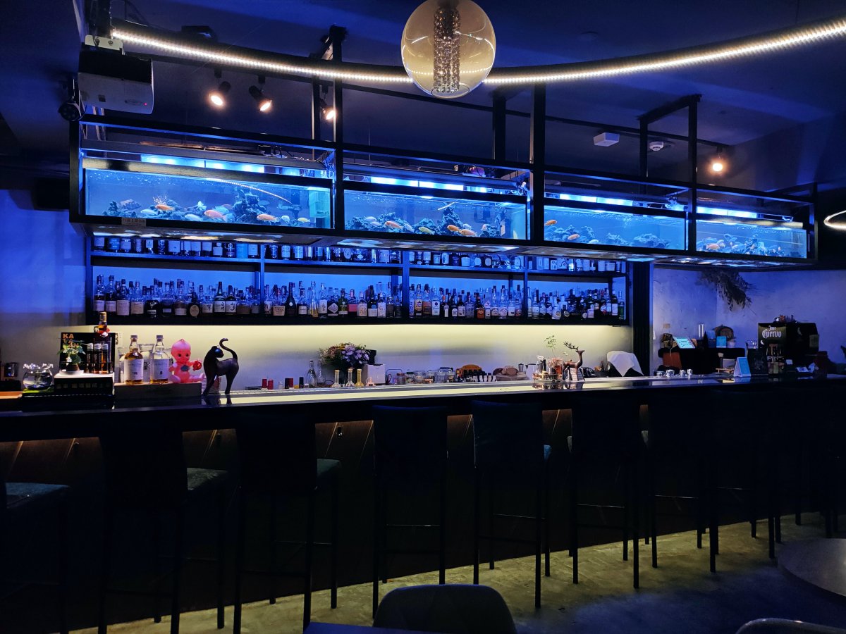 妞妞們有看過店裡有水族箱的酒吧嗎?「Nep.」的店名取字海王星「Neptune」,希望來到店裡的妞妞可以感受到海洋的魅力以及宇宙般的特殊設計,進入店內時第一眼就可以看到星空燈光下的時空迴廊,大家都可以在這個空間享受無比的沉靜感!拉開玻璃木門正式進入店內,印入眼簾的即是一整排高掛在吧台上方的藍色水族箱,吧台桌面採用反射性鏡面材質,讓游泳的魚可以陪伴著酒杯療癒心靈,就跟來到水族館一樣呢。