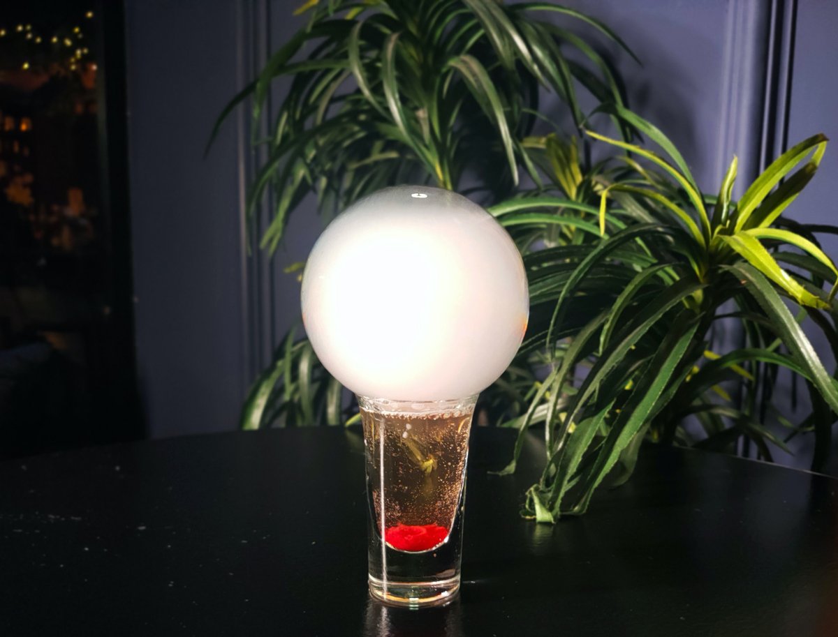 而這杯調酒「吉時之選」喝起來更是甜甜的非常好入口!裡頭的紅色小顆粒是「Nep. Lounge Bar」自製的莓果醬,喝起來有微顆粒感呢,上頭的泡泡還帶有煙燻的香氣,喝之前也可以學「瘦子」輕輕的吻破泡泡,拍幾張好看的Boomerang呢~