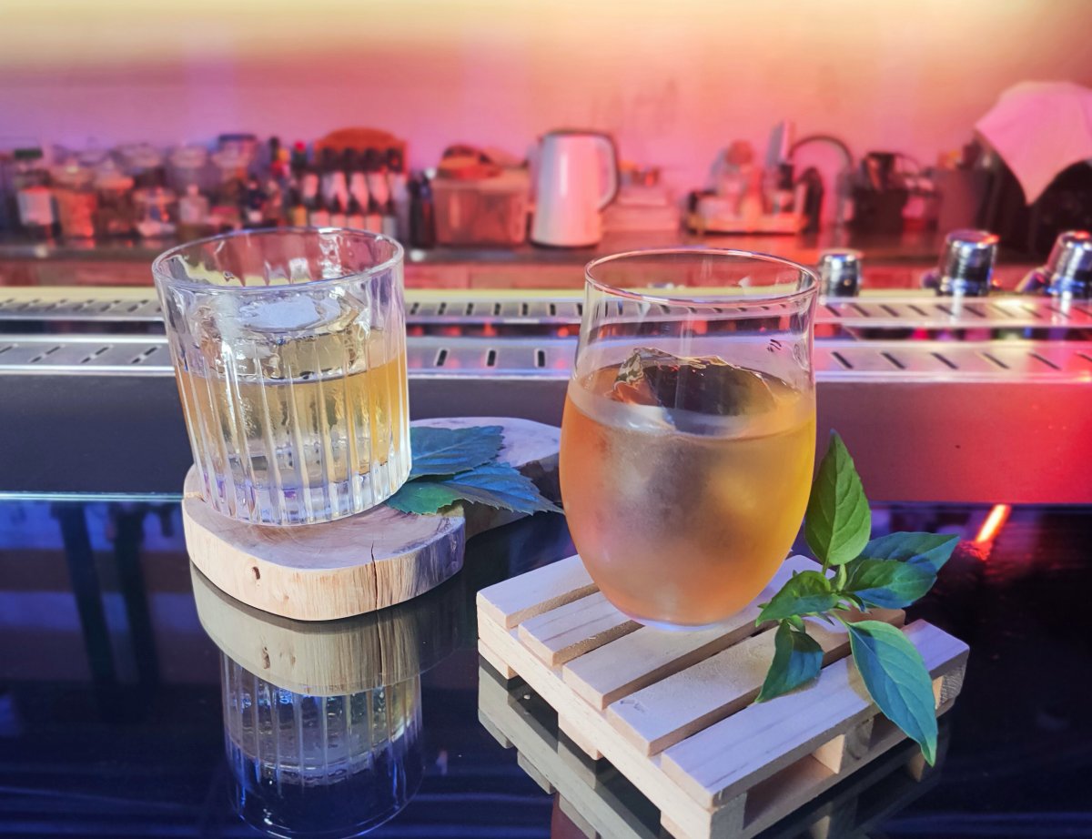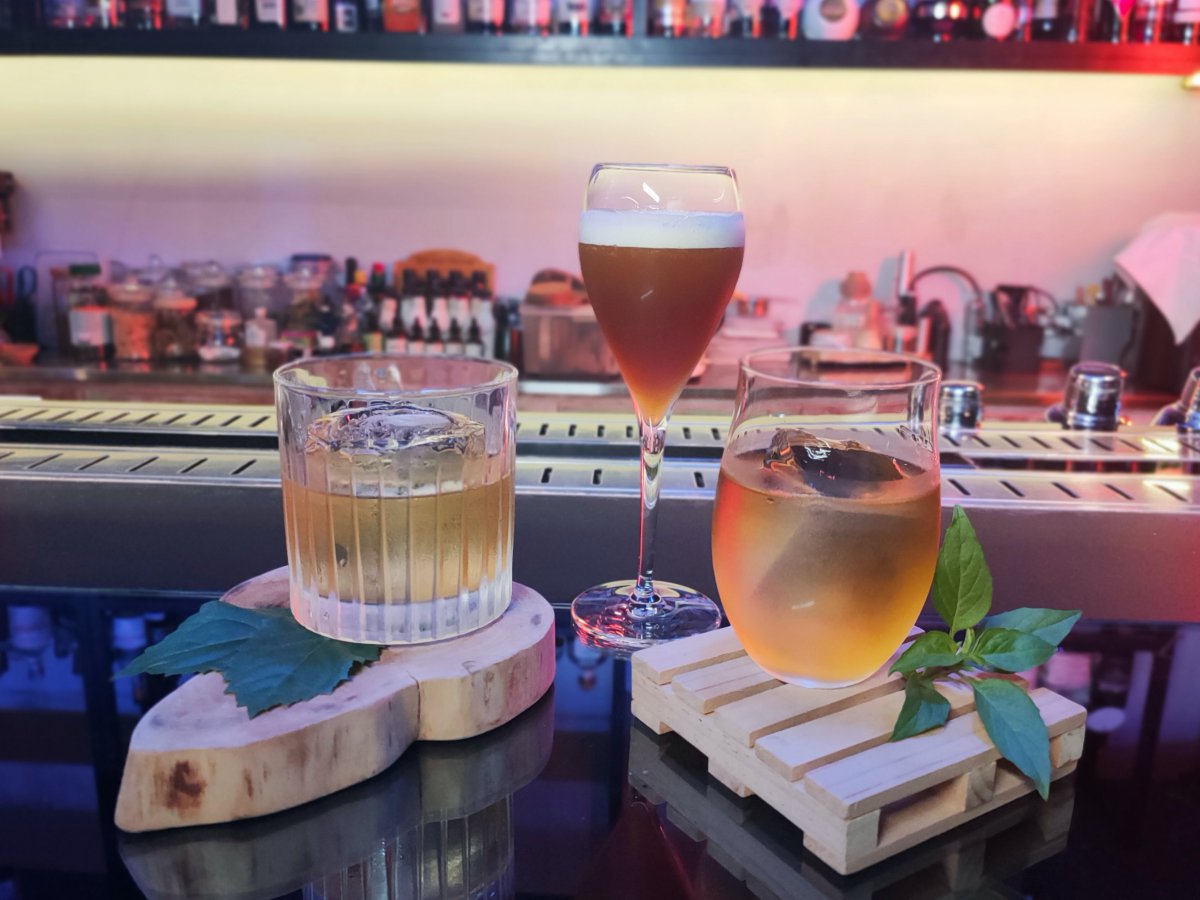 想要來點特色調酒絕對不能錯過來自調酒師「莎莉」精心設計的這幾款調酒~由左至右首先是「派特森」帶有些許的草本香氣,基底使用的是美國波本威士忌,喝起來有點Old Fashion的感覺,一旁的葉子是廣藿香,妞妞們可以拿起來感受它的味道,在調酒裡頭也能找得到喔!還有中間這杯有著咖啡和椰子蘭姆酒香氣的「漫步秋夜」,甜甜的滋味有吃甜點的感覺,喝起來有點微涼感,彷彿有在秋、冬的夜晚散步時,在冷風中深深吸一口氣的感覺。