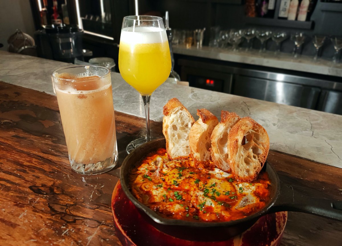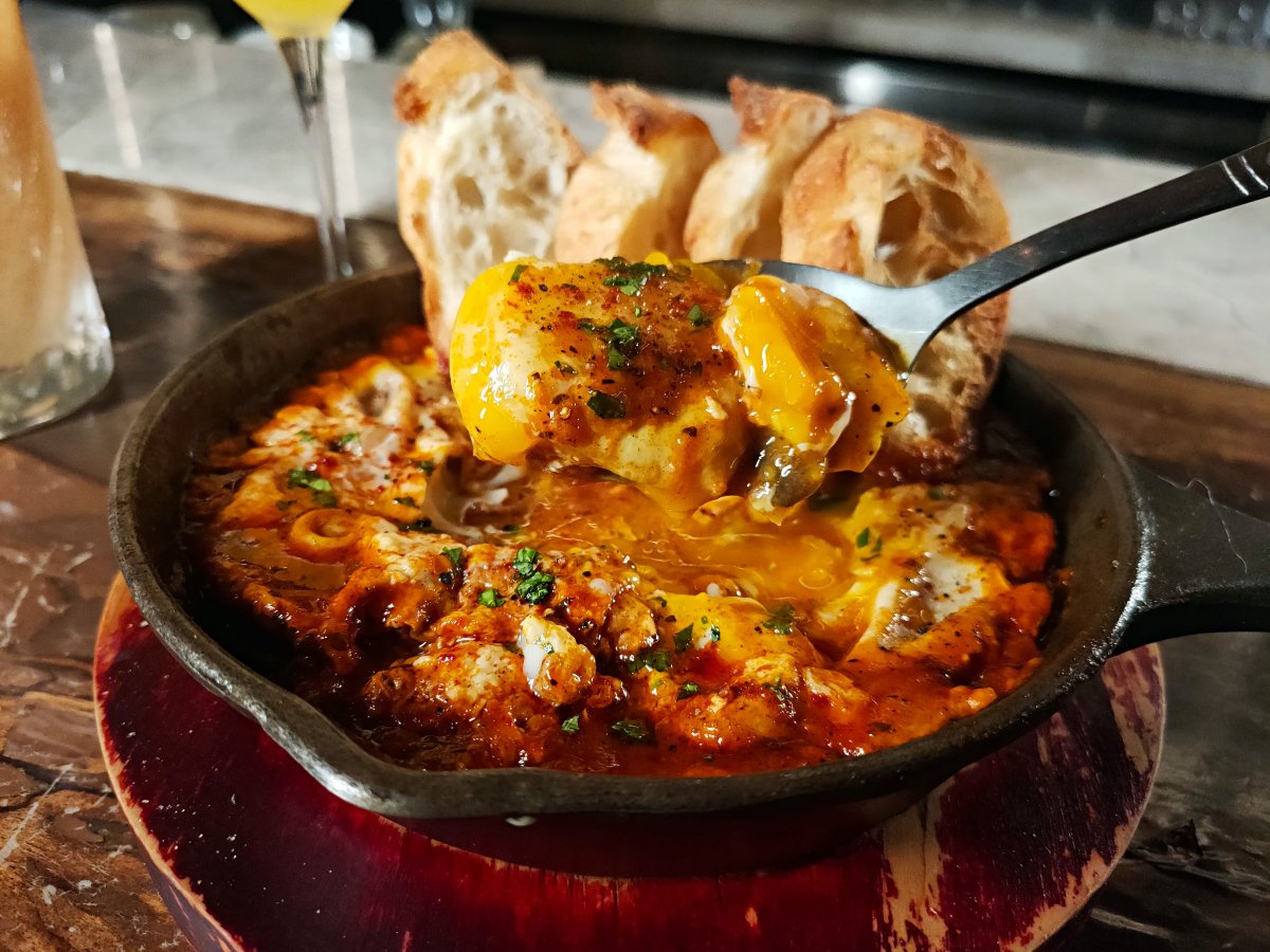 餐點方面,「Bar春花」的食物絕對不會讓人失望!這道充滿辛香料的「北非烤蛋」更是妞編輯的最愛~烤蛋裡頭加入了番茄、蘑菇以及甜椒,半熟的口感吃起來像起司一樣滑嫩,有點微辣但是卻是裡頭畫龍點睛的存在,配著麵包吃更是完美,美味程度讓人一口接著一口吃不停~(不過11點後就不供餐囉,嗚嗚嗚難過)