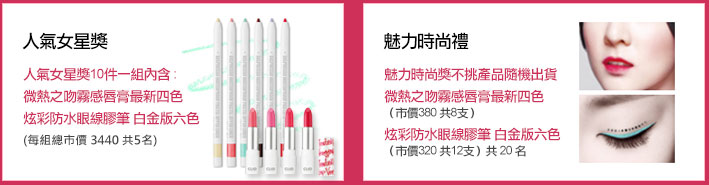 本活動之獎贈品為贊助單位所提供之品牌炫彩防水眼線膠筆白金版(6色)與微熱之吻霧感唇膏2014新色(4色)。其獎項一為新品共10支組(6支眼線膠筆,每支市價NT320,與4支唇膏每支市價NT380。每組總價市值NT3440),得獎者為3名;其二為隨機單品1項(自前述產品之6支眼線膠筆與4支唇膏隨機抽出),得獎者為20名。