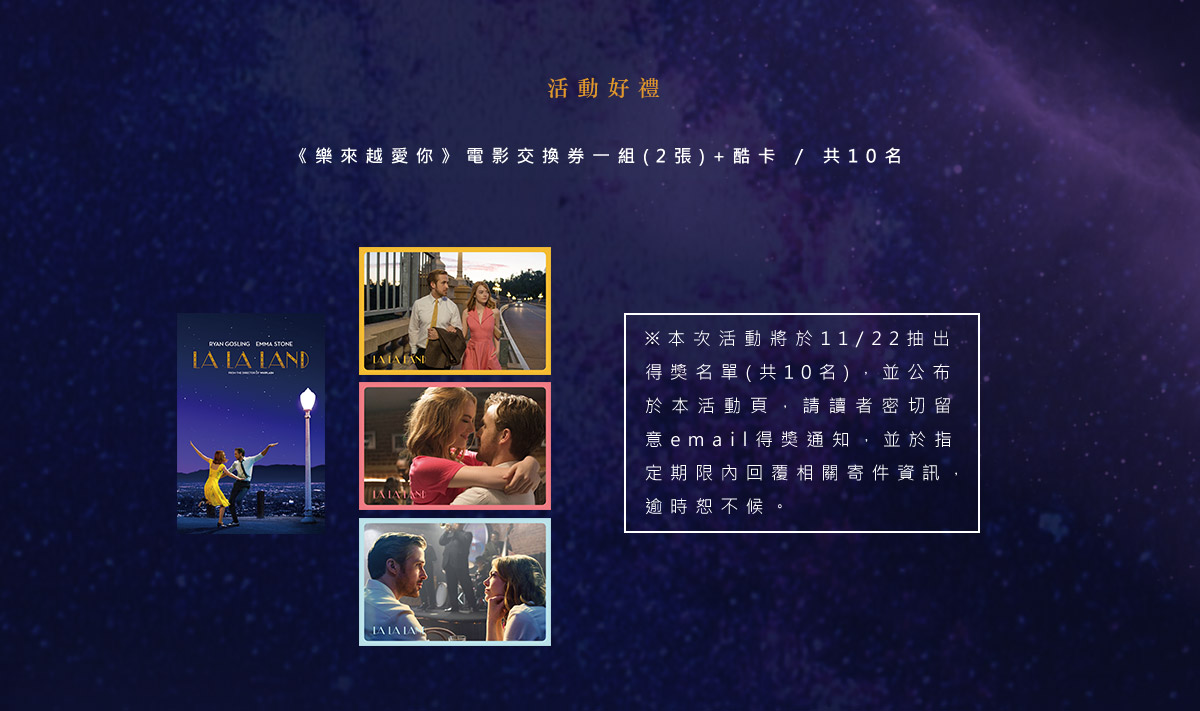 - 本活動之活動時間為即日起~2016/11/20,以台灣時間為基準。得獎名單將於11/22公佈於活動頁,