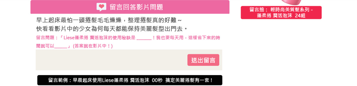 留言問題:「Liese蓬柔捲 潤活泡沫的使用秘訣是 _______!我也要每天用,這樣省下來的時間就可以______」 (答案就在影片中!)