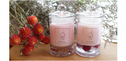 這三種精油特性,能為失去活力的厭世代驅離緊張和壓力,帶來積極的態度!利用花香來撫慰心靈,也利用木質調香氣給予支持。蠟燭下方再以可愛的圓仔花點綴裝飾。就是要讓大家點燃蠟燭就能趕走壞心情,