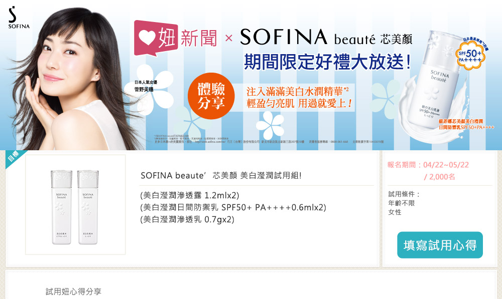 我很高興可以得到Sofina的試用品!!它用起來很舒適,不油膩、很清爽,我很喜歡。