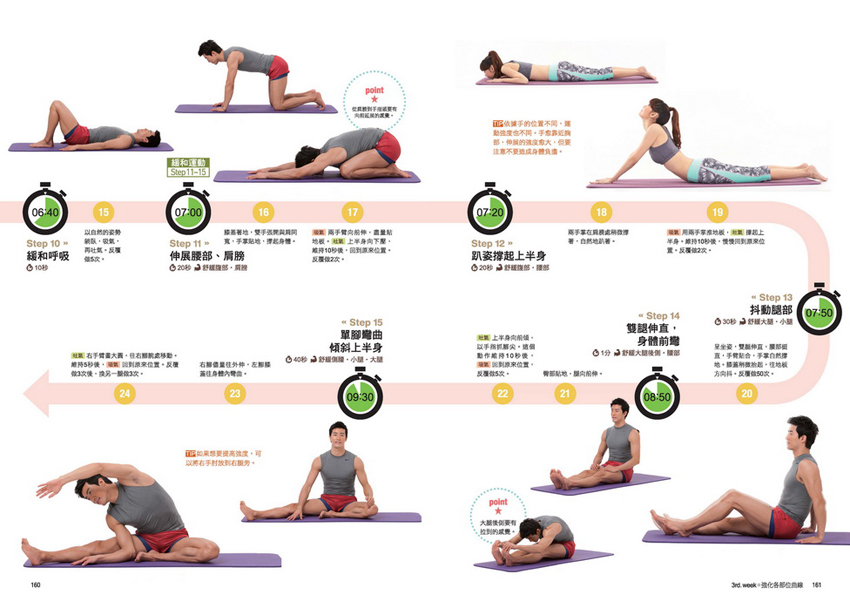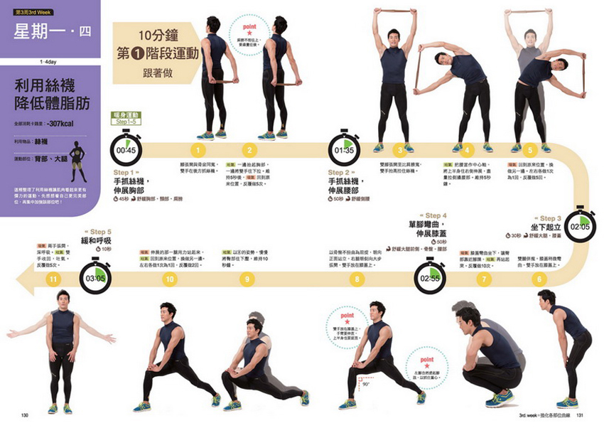 每一個階段都標示了運動日期和運動目標(如強化骨盆......等),以及可消耗的卡路里和重點訓練的部位。並以圖像標示每一個動作的所需時間,一目瞭然!以10分鐘為基準,讓運動更有效率!