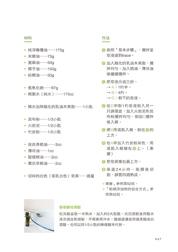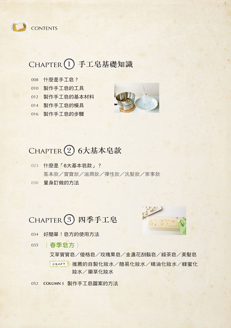 學會「基本款」、「寶寶款」、「滋潤款」、「彈性款」、「洗髮款」、「家事款」6大款,從此手工皂輕鬆變化。不管是乾燥肌、敏感肌、一般肌、油性肌,可自由地調整與變化,每一種皂款都適用。再搭配春夏秋冬四季所喜歡的材料,一年四季都可以做全身肌膚的呵護與保養。洗髮皂、沐浴皂,還有洗碗盤、打掃、洗服的居家生活皂。