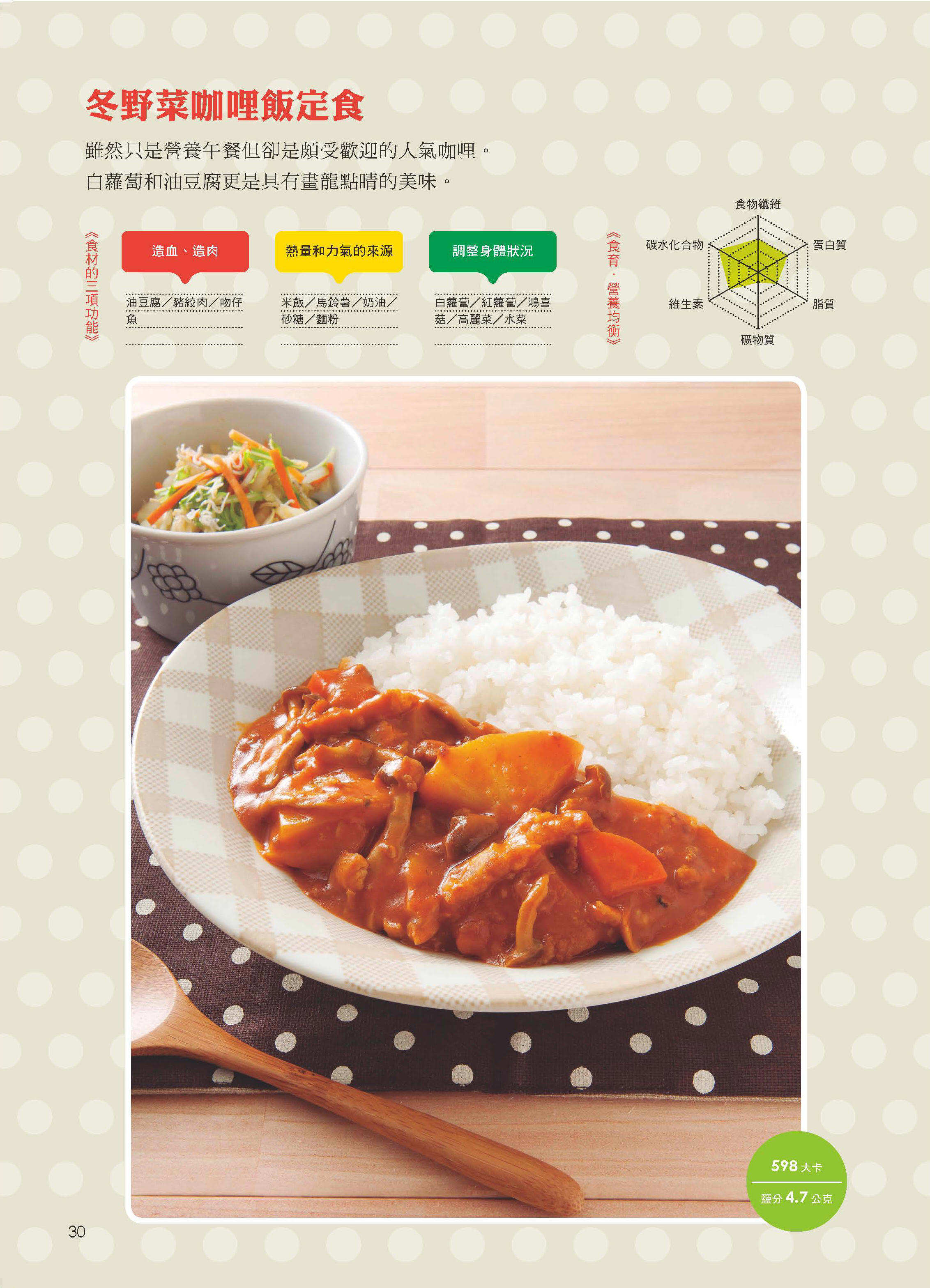 在營養午餐中積極的加入許多菜類,菜的使用量和其他食譜相比超出許多。特別是豆腐,像是炸豆腐、油豆腐等的大豆製品,作法相當豐富。