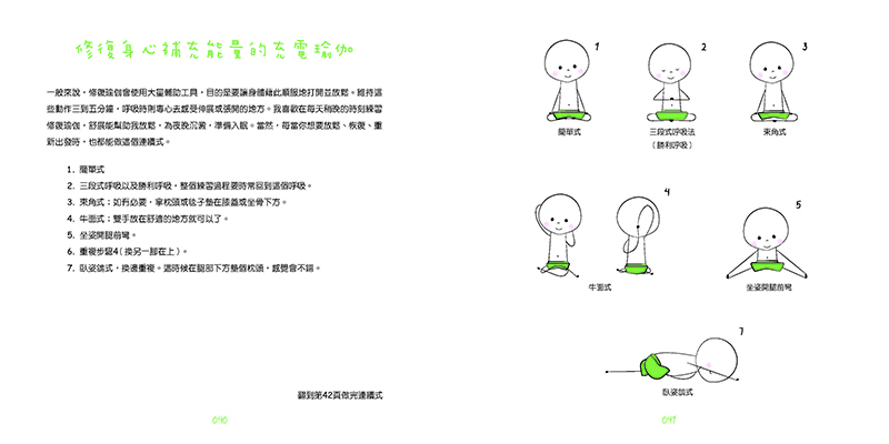 本書打破坊間瑜伽教學過於嚴肅、過於追求每個動作完美與流暢度的現象,以可愛的「瑜伽娃娃」為主角,畫出不同場合的伸展操。有專為女性打造的,從經期前、經期來、懷孕、到更年期,緩和身體不適的瑜伽;也有各種情緒來臨時能夠平撫心情的瑜伽;更有各種等待時刻充分利用時間的瑜伽。巧妙地將瑜伽帶入日常生活,讓讀者輕鬆進入瑜伽的世界。