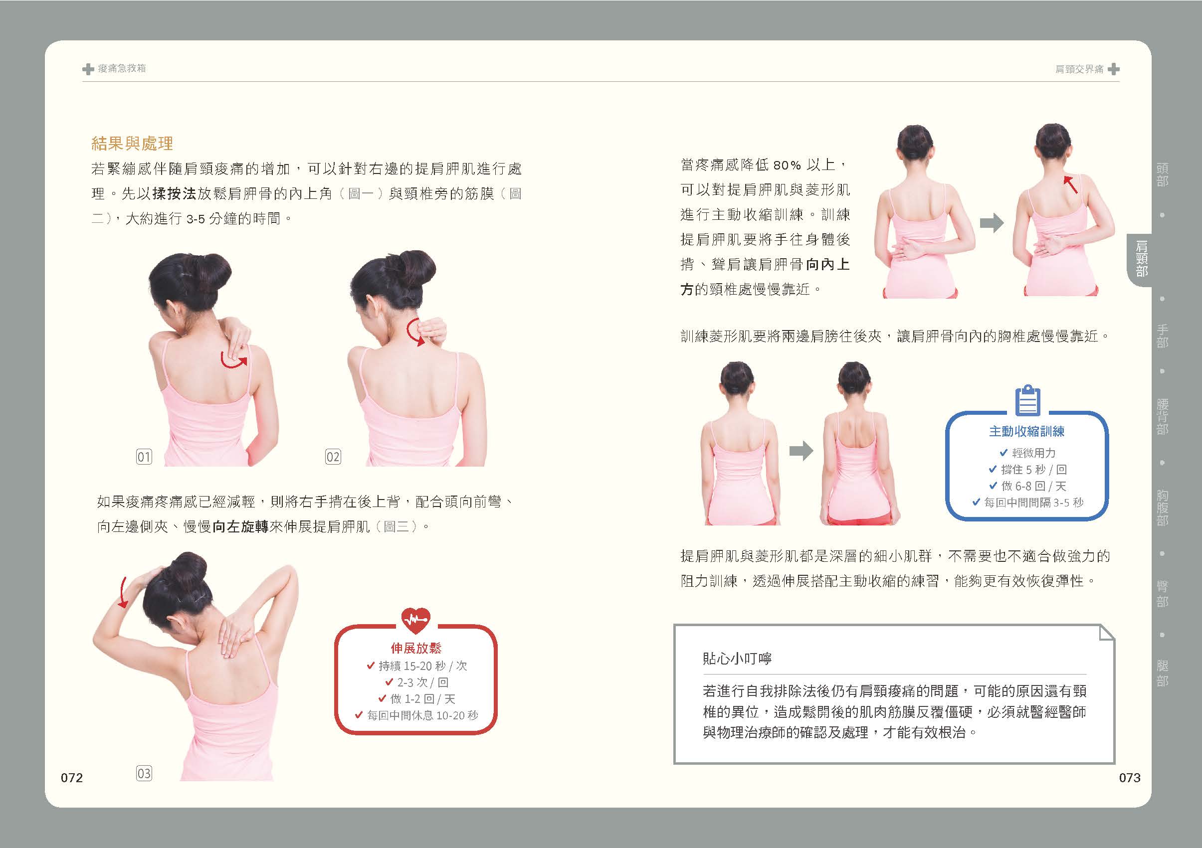 1. 先檢測,再處理:單一部位痠痛可能牽涉不同肌肉群,先使用自我檢測方法,簡單幾個動作就能找到痠痛的真正原因,才能真正舒緩痠痛。
