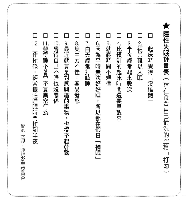 即日起至 2015年04月20日 23:59 登入會員後,參考上方的隱性失眠評量表