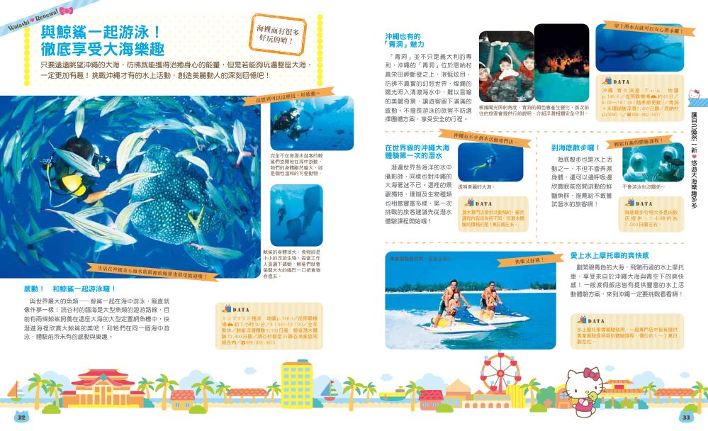 從除魔獅探訪、單軌電車、傳統裝束、燒陶、鯨鯊浮淺等主題式旅遊規劃,分那霸、首里周邊,中南北部特色介紹;另附經典、新潮兩天一夜行程,適合規劃深度行程。
