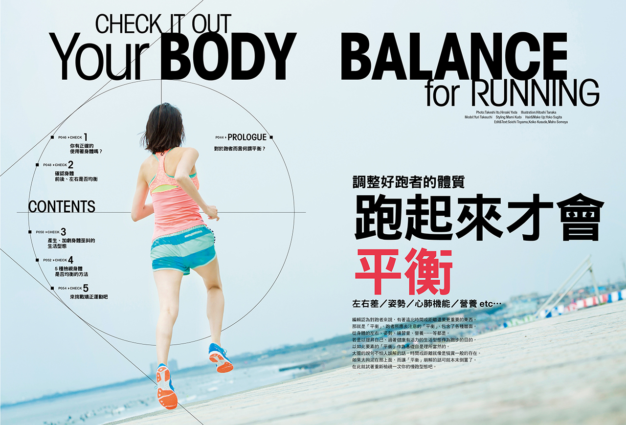 調整好跑者的體質,跑起來才會平衡!下班後編輯部認為對跑者來說,有著遠比時間或距離還要更重要的東西。那就是「平衡」。跑者所應去注意的「平衡」,包含了各種層面。從身體的左右、姿勢、練習量、營養……等都是。若是以提昇自己、過著健康有活力的生活型態作為跑步的目的,以如此要素的「平衡」作為基礎自是理所當然的。那麼,透過本期的內容,在此就試著重新檢視一次自己的慢跑型態吧。