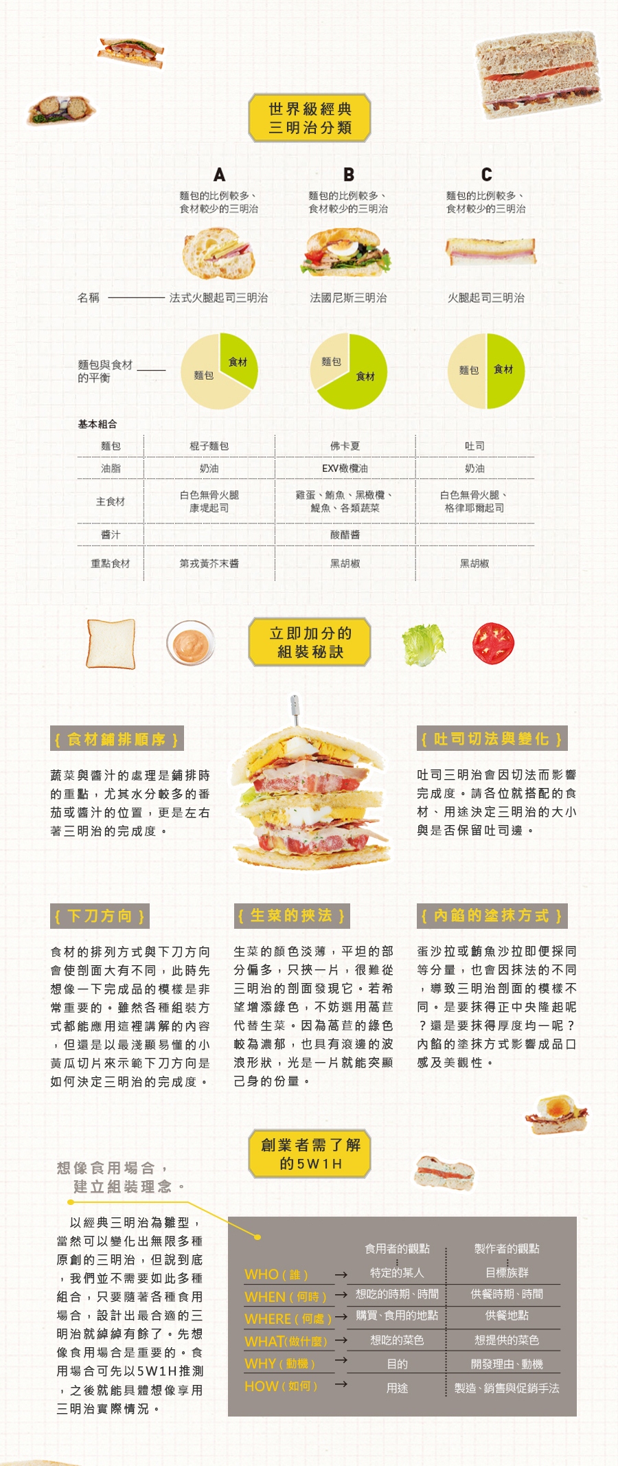三明治是全世界許多國家都有的食物,製作能豐盛亦能簡單,單手就可食而且千變萬化!本書作者-永田唯擁有18年以上設計開店級三明治的專業經驗,以職人精神研究這項平民食物的無限組合可能,特別用「美味公式」、「剖面解說」、「步驟圖示」詳解關於三明治的一切細節,更精選出世界各國的經典三明治。除了這些經典,更要教你從中延伸應用百種食譜,徹底拆解讓三明治最好吃的美味法則!