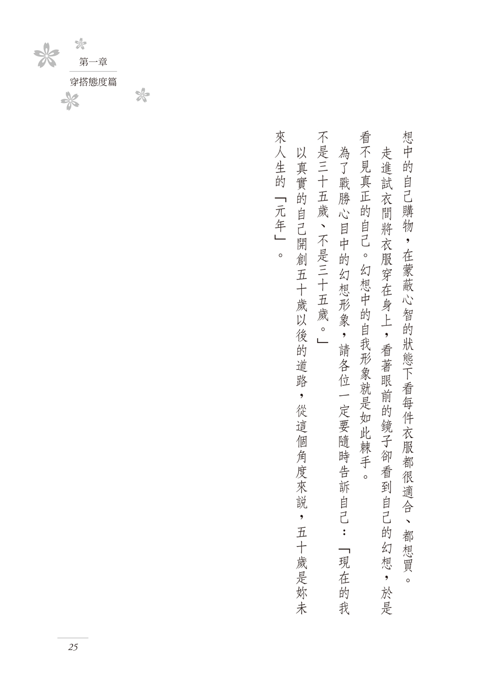 趁有體力時,徹底清理衣櫥中不符合你年齡的衣物,丟棄過去時尚雜誌給你的舊思維及穿搭法,現在的你,不需每天都有不同造型,只要掌握最適合中年的優雅休閒風。添購讓你穿起來有自信、好搭配,具優雅休閒風的衣服,就算偶爾重複穿也無妨。現在起,打造全新的服裝計畫,五十歲是你的全新時尚元年!