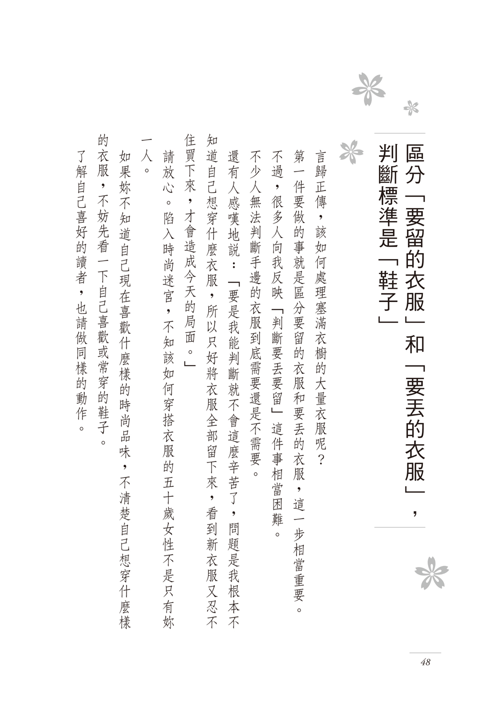 ■趁有體力時開始清理你的衣櫥,原則是:「清理之後,衣櫥內的八成是原有衣物,兩成是新添購的。」