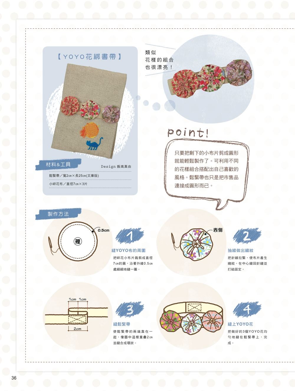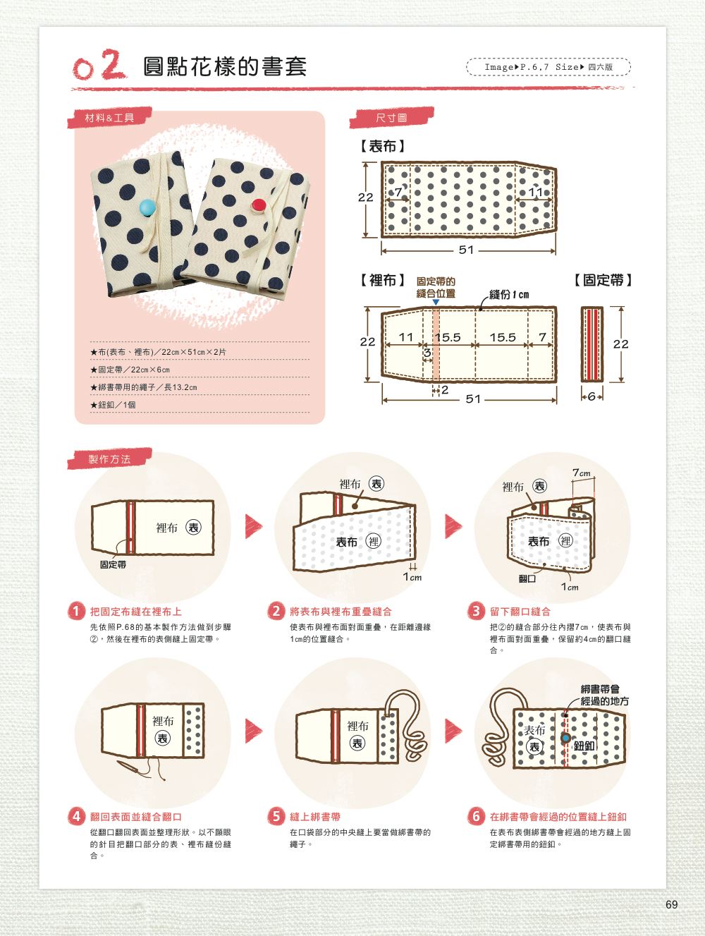 本書收錄25種風格各異的書套,從海軍風、夢幻風、極簡風、禮服風、信封造型、提包造型、雙面設計、多功口袋等一網打盡,把自己喜歡的做出來,就可以隨時配合書籍的內容或當下的心情替換使用。