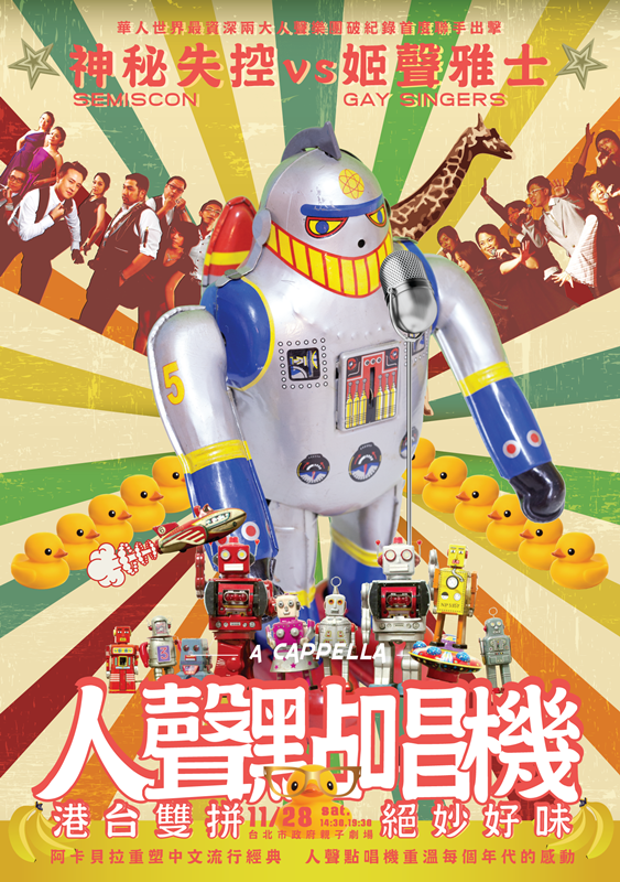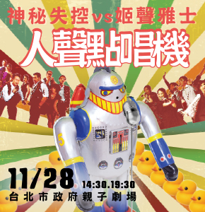 今年,我們又帶著《人聲點唱機》回到了台北,今年邀請到華人世界最資深的兩組阿卡 貝拉樂團-神秘失控人聲樂團(Semiscon)及香港老字號阿卡團-姬聲雅士(Gay Singers)一起, 重現70-90年代港、台兩地最火熱的經典名曲。無論是楚留香與京城四少、草蜢隊還是小虎 隊、金曲龍虎榜或著龍兄虎弟…等,港、台雙拼,絕妙好味將重新呈現,唱出你心裡的觸動。