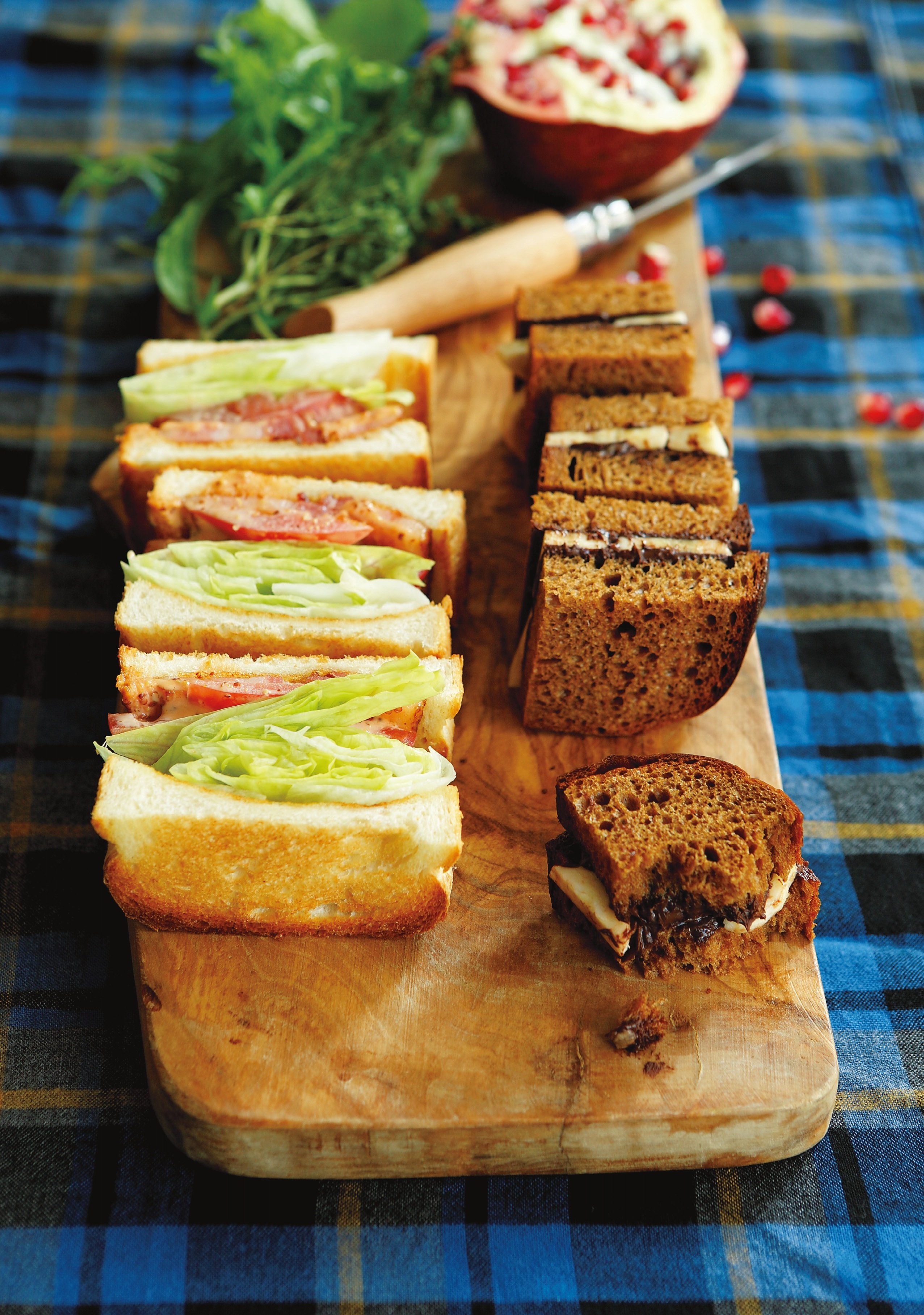 3 吐司麵包先烤成表面呈金黃焦酥。其中一面抹上奶油,依序放上一半分量的培根和2片番茄,淋上一半分量的番茄奶醬。再疊上一半分量的生菜,用兩片吐司夾起。以手按壓使夾餡位置安定,切下吐司邊,再切成自己喜歡的大小。另外兩片吐司也用相同方法做成另一個三明治。