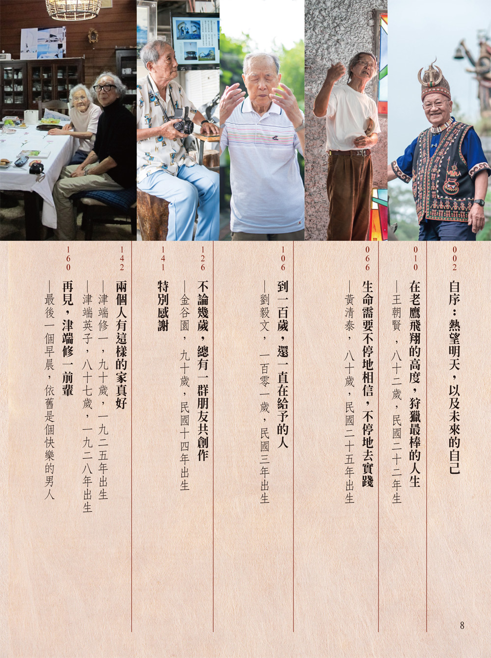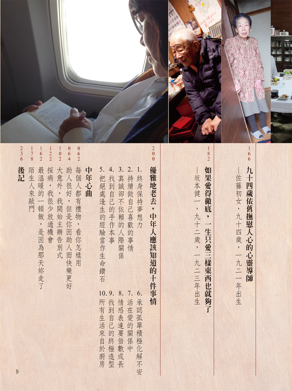 接下來,你會閱讀到恩愛的老夫妻和失去配偶的九十多歲作家、書店老闆,同樣擁有我所說的「愛」與「存在感」。我幾次在演講時,用「越活越美麗的誓言」做標題,你也可以這樣去理解我在尋找的未來。