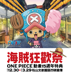 《海賊狂歡祭-ONE PIECE動畫15週年特典》由台日團隊攜手打造,活動時間為104年12月30日至105年3月29日,於松山文創園區盛大舉行,更多詳情將陸續公開,請上Facebook粉絲團:https://www.facebook.com/ONEPIECEANIMETW15查詢更多詳情。