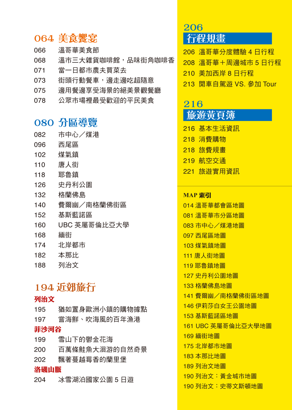★超詳盡實用地圖:溫哥華全圖、各分區景點、餐廳、逛街和主題街道等全方位的地圖,只要按圖索驥就能輕鬆遊玩。