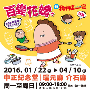 《百變花媽 新我們這一家》特展即日起至4月10日在中正紀念堂瑞元、介石聽展出 (除夕、初一休館),更多展覽資訊請上官方臉書粉絲團 : www.facebook.com/AtashinchiTW,或洽詢專線02-2391-6796(每日服務時間10:00-18:00,國定假日公休)。