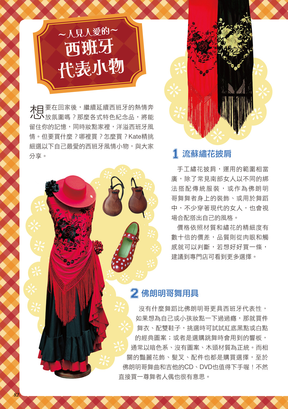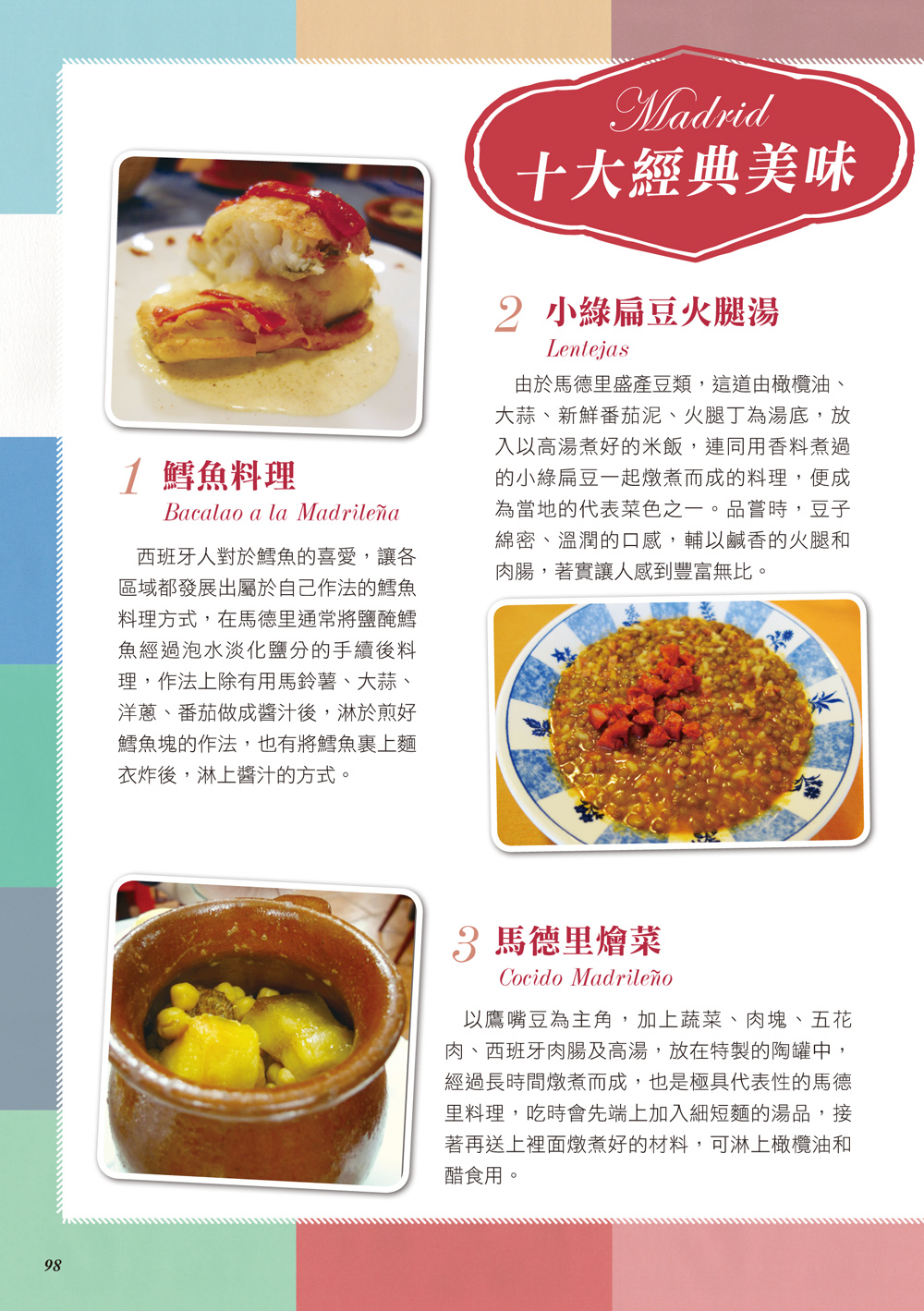 l 文化剖析:大篇幅介紹西班牙文化及特色節慶,番茄節的激戰、三王節的遊行、四月節的狂舞等,即使不在當地也如親臨現場般的了解。