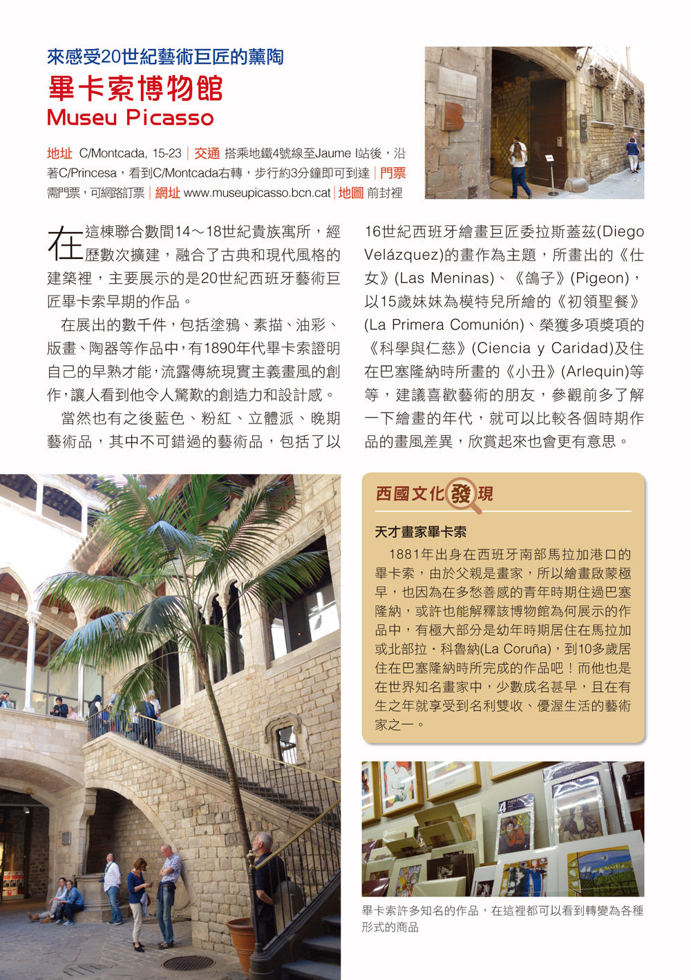 l 主題行程:每個城市都有設計「主題小旅行」單元包括像:經典博物館、百年老店、高第建築、美食饗宴等等,以主題方式介紹出該地景點、特色餐廳。