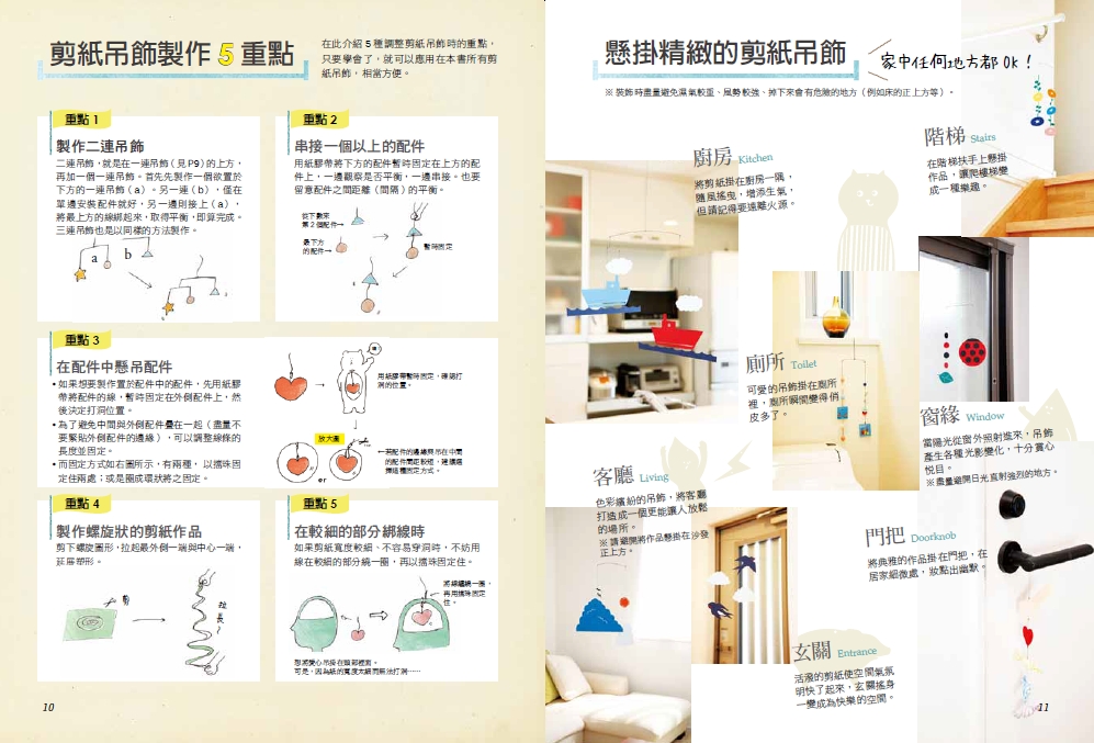 看似單純的剪紙,可隨著不同心情、主題、顏色、花樣等,產生多種變化。甚至可將剪紙立體化,做成剪紙旋轉吊飾,懸掛在家中的任何角落,使吊飾隨風搖曳而晃動,不但可美化空間,亦能改變室內氣氛,讓自己心情愉悅,心靈感到平靜、被滋潤。不同空間的剪紙吊飾,也會產生不同效果,像是: