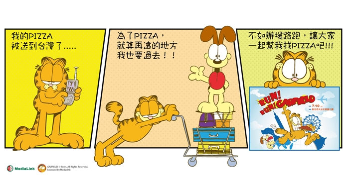 努力運動仍不忘以美食犒賞肚皮的加菲貓,在某次訂購PIZZA打算大快朵頤的同時,才發現外送員竟把PIZZA送到台灣。因此他決定來台舉辦一場盛大路跑活動,號召各方英勇跑者幫忙找回寄丟的PIZZA。