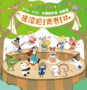 台灣設計館自 3 月 12 日(六)起推出春季新展「搖滾吧!青春-插畫設展」,集結 12 位台灣現今最夯的插畫家化身成搖滾樂手,以青春無敵音樂會的呈現方式,透過別具個人風格的手法將展場櫥窗打造為表演舞台。此外,參展的12 位插畫家特別為此次展覽繪製了代表自己的角色,每人各選一件樂器融入角色中,由插畫家-傻笑鱷魚操刀,以閃亮舞台為背景,以青春樂團 SHOW 出活潑鮮明的搖滾插畫新世代!