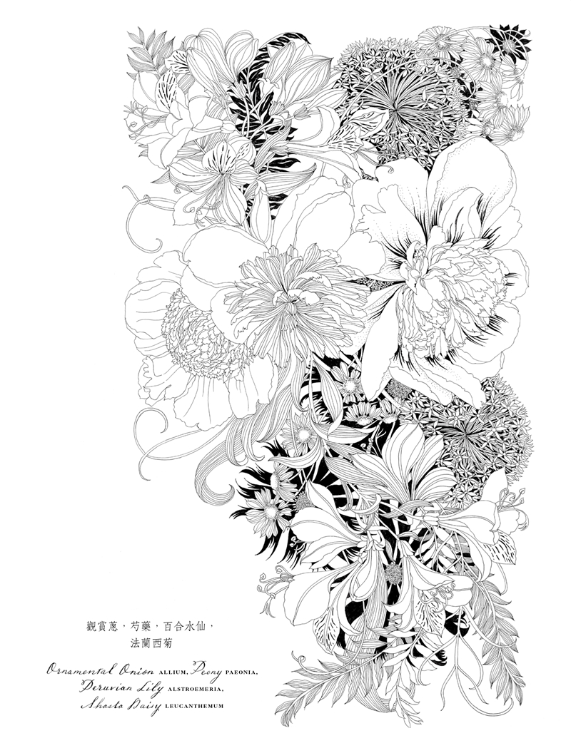 二十款讓人驚豔的盛開花束,以繁複的線條及精心的設計,每款圖樣都蘊藏不同品種的美麗花朵,精緻新穎且風格獨具。每幅作品都以高質感及高磅數的紙張裝幀印製而成,可自由使用各種不同的創作媒材予以上色。嬌嫩鮮豔的浪漫花樣,讓療癒的花草著色書帶你自由翱翔在著色的喜悅中,並提升個人創造力。