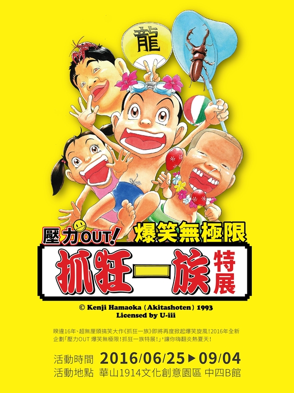 還記得精力無限的小鐵嗎?沈默寡言的阿仁嗎?《抓狂一族》漫畫作者浜岡賢次,為了世界首次的抓狂一族特展,特地為台灣粉絲們繪製經典角色的漫畫原稿跨海來台與粉絲展示,抓狂一族特展絕對要用最讓人瘋狂、爆笑噴飯角色,嗨翻整個整個夏天!喜愛抓狂一族的朋友請勿錯過這非常難得的機會。