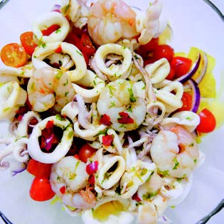 5. 草蝦仁剖背去腸泥燙熟,透抽切圈狀入鍋汆燙熟,冰鎮備用。加入對切小番茄,再淋上醬汁拌勻。