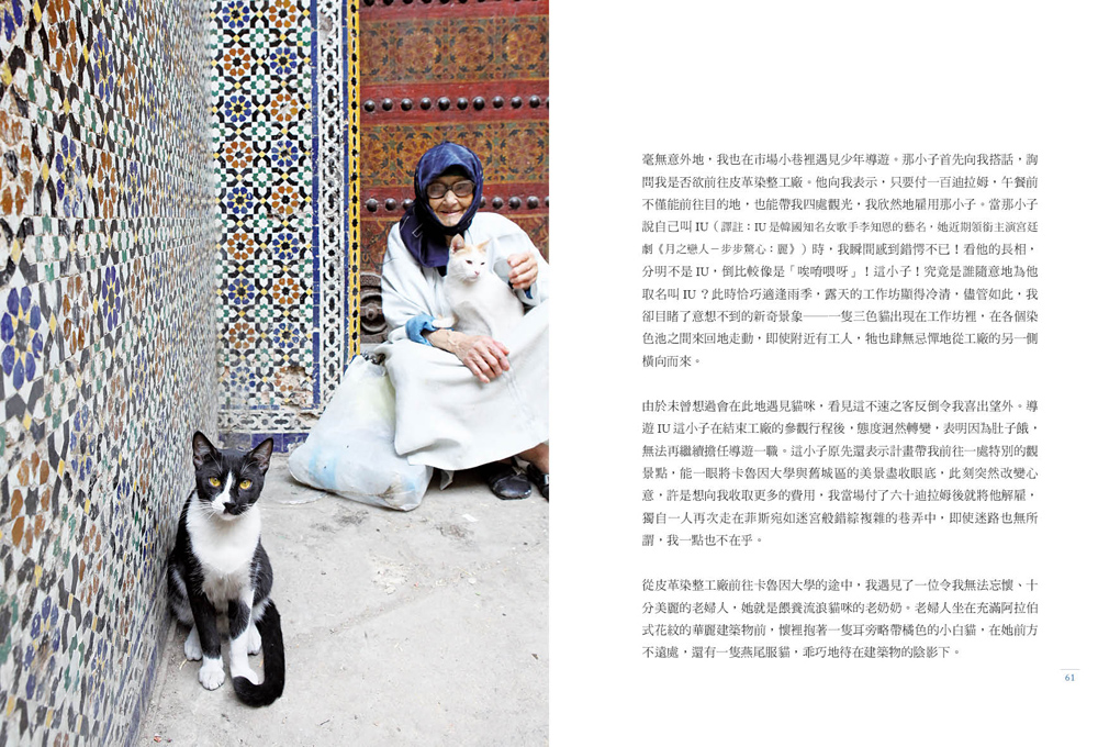 2009年我去寮國龍坡邦旅行時,曾被當地迥然不同於韓國的風景嚇到。當時我在露天餐廳吃飯,一隻貓就突然跳到我膝上,而且街上大多數的貓都願意讓人類撫摸,牠們一副理所當然的模樣。連被許多人貼上危險國家標籤的印度,也不會虐待貓咪,反而將貓視為共生共存的對象。甚至連自己都窮得沒飯吃、得經常挨餓的貧民區居民,也會把魚和雞內臟餵給貓吃。看到這些景象的我,心中一陣刺痛。在摩洛哥和土耳其,和貓一起共生,是日常生活的一部分,也是信仰的一部分;而在臺灣的貓村或日本的貓島更不須多說,那是人貓幸福共處的地方。