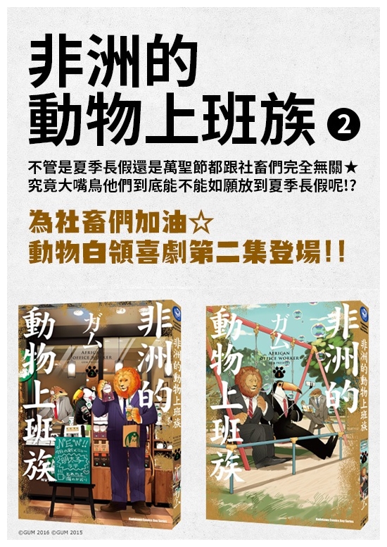 《非洲的動物上班族》以各種非洲常見動物為主角──獅子、大嘴鳥、蜥蜴三「隻」,巧妙結合這些動物的特性以及日式社會的日常,描繪出充滿幽默與趣味性的作品。作者最初於twitter和pixiv推出時便引起廣大讀者回響,中文版第一集已好評再版!