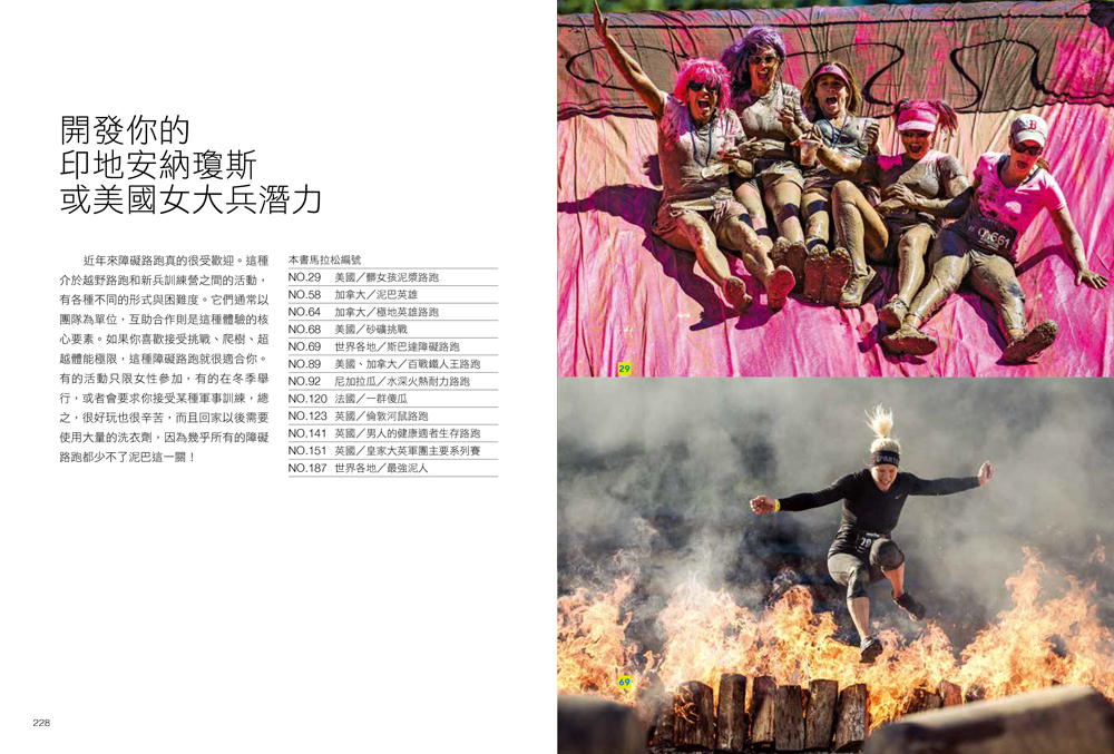 本書依地區畫分,chaper1收錄195項路跑賽事,從3公里到350公里、從跑好玩的到傳奇等級,各種類型的賽事都一網打盡(有景色壯麗的,有挑戰體能極限的、以美食為號召的,還有扮裝路跑等等)。