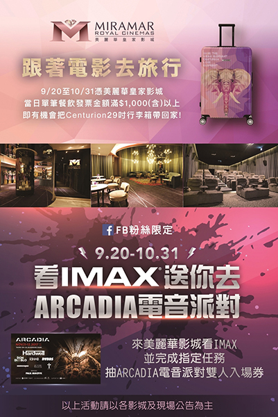 10/31 前,來美麗華影城看IMAX並完成粉絲限定任務,就有機會獲得ARCADIA電音派對雙人入場券!