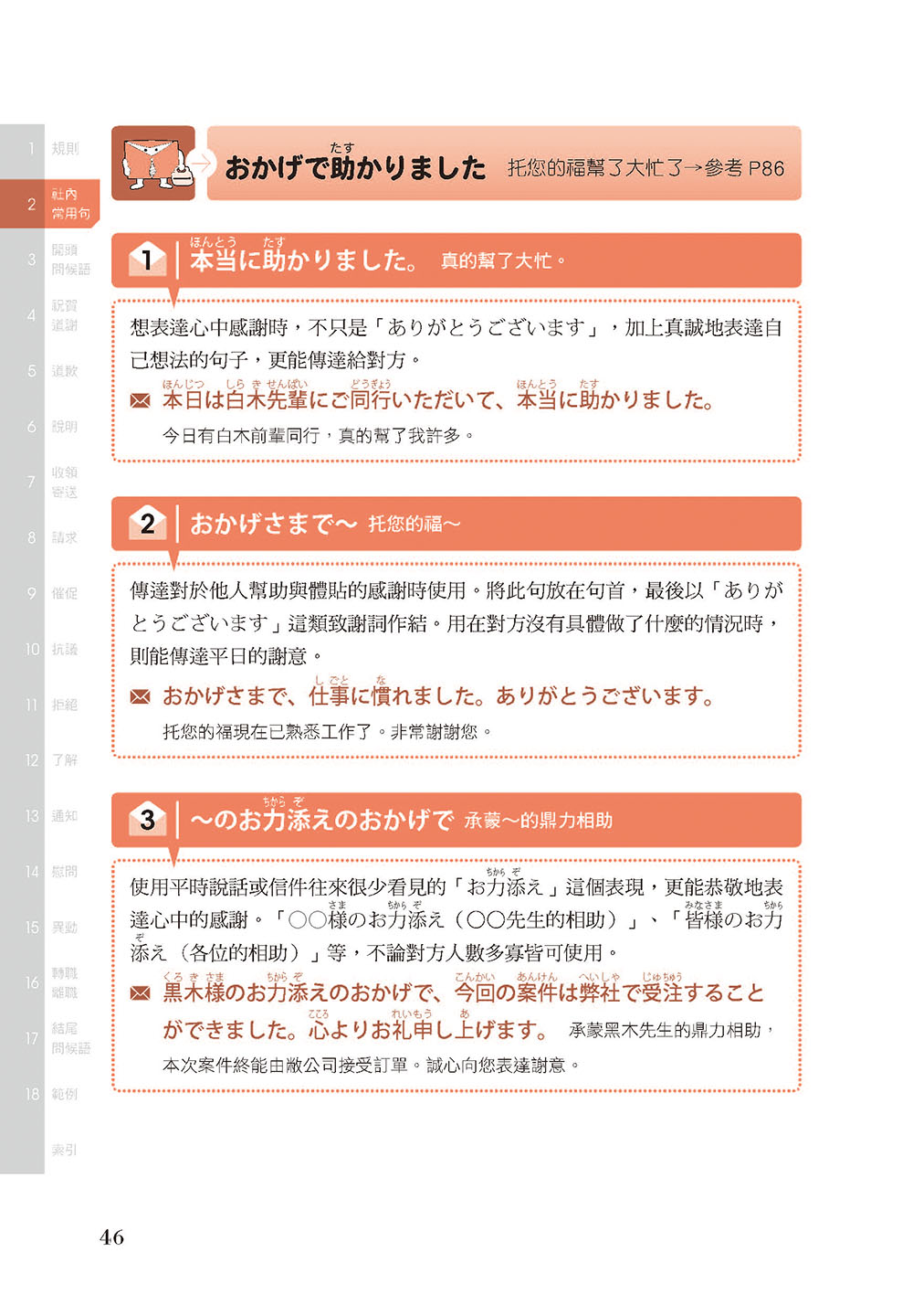 全書分成信件規則、開頭問候語、致謝、道歉、委託、催促、抗議、拒絕、了解、說明、問……等17個職場上絕對會遇到的實用主題,將這些情境中會使用到的句子,整理出不同層級的敬語,方便你查找!