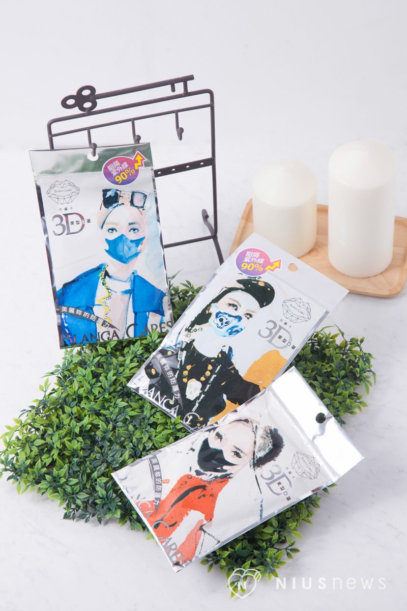 如今口罩不只擁有防護的功能之外,更成為「穿搭」的單品之一呢!具有時尚外觀的布蘭卡3D美型口罩,拿起外包裝的瞬間還以為是哪本時尚雜誌的內頁,如此特別的包裝圖案可是由時尚插畫家-Garytu塗至道所創作的。拿出後可以發現口罩有無鼻樑壓條設計不會破壞美美的妝容,而且3D的立體剪裁還可以修飾臉部線條。(感覺臉又小一吋XD!)三款圖樣款式(低調奢華款、率性單寧款、酷玩街頭款)能搭配妞妞們每日的穿搭STYLE呢!讓口罩的時尚度upup~