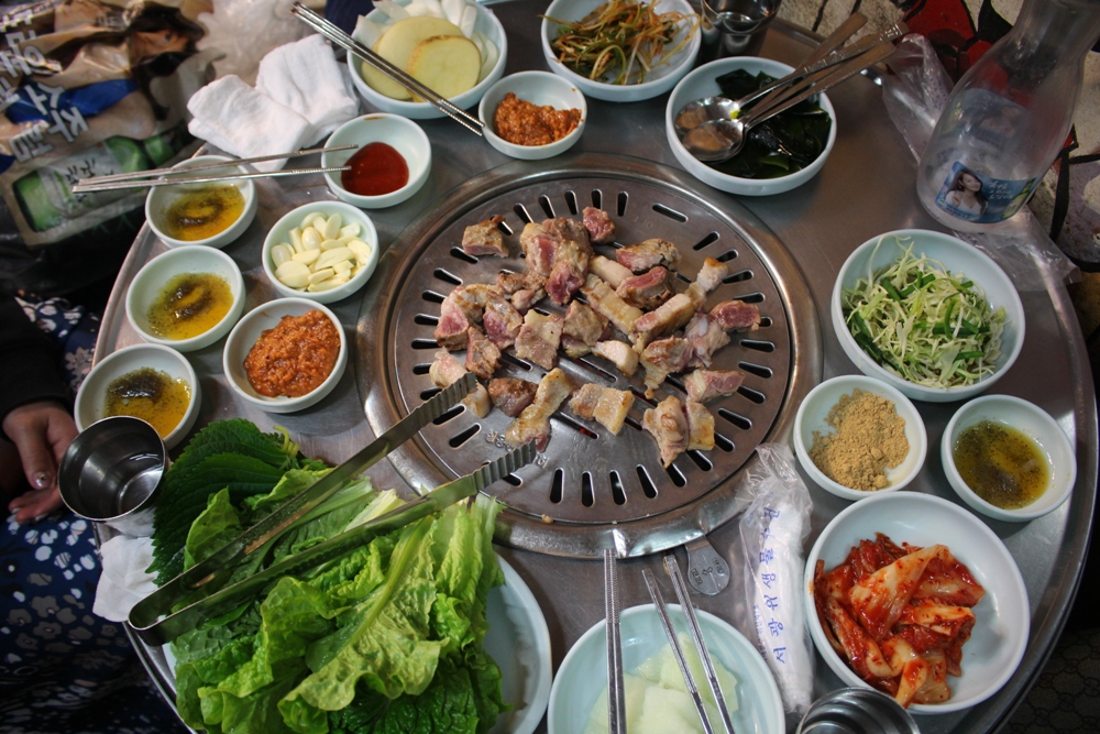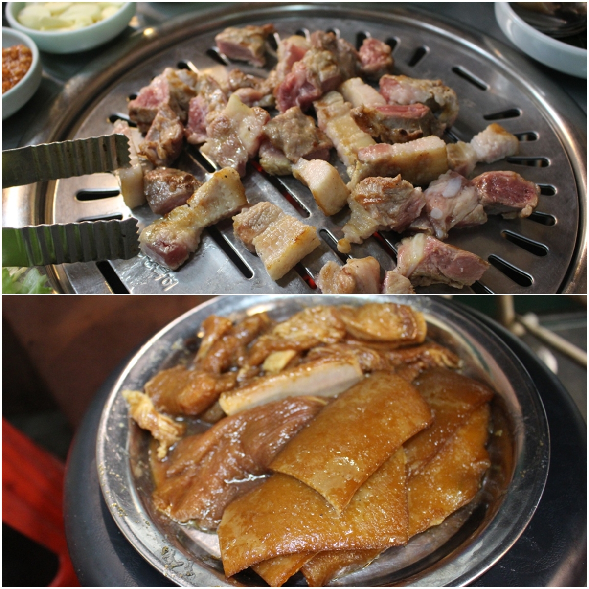 雖然比起新式烤肉店來說,已經有五十年歷史的「弘益燒烤」的確是老舊許多,加上沒有抽油煙機和抽風機等設備,讓空氣中充滿了濃厚的油煙味,但是這並不影響肉品本身的美味,甚至連烤盤中央附上的大醬湯都有別於其他烤肉店的味道,看起來與其他店家的大醬湯無異,沒想到喝起來卻非常的辛辣,著實讓我嚇了一跳。