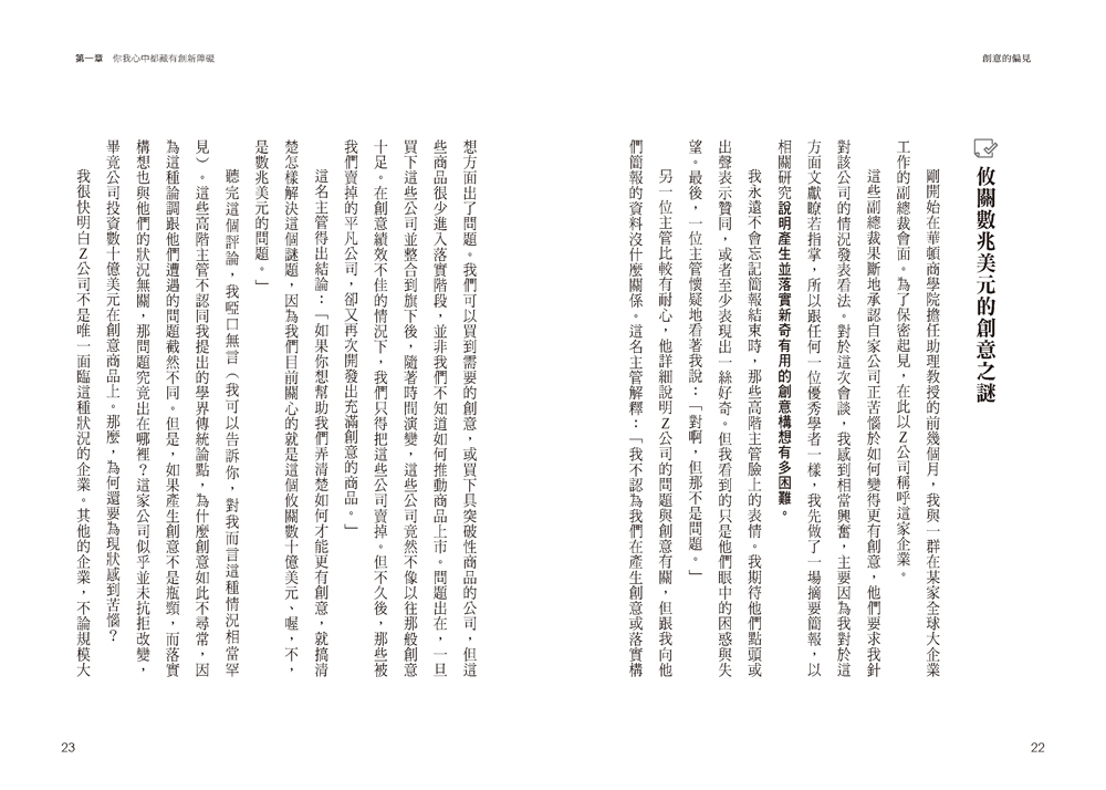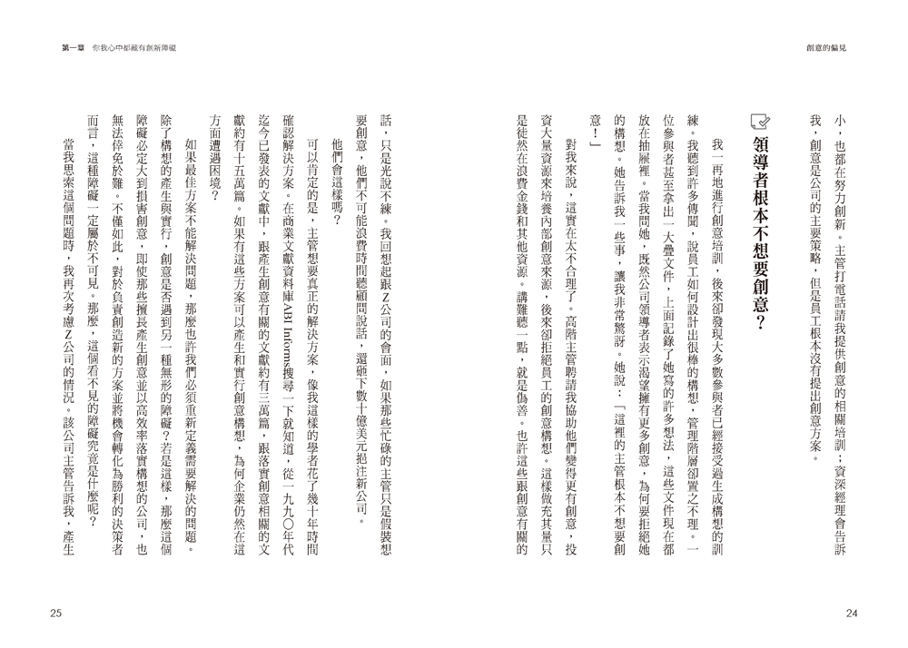 .從人類為何抗拒創意的嶄新角度,讓讀者認清自己與他人都可能對創意存在偏見,並提供實用方法克服創意帶來的不確定性與不安感。