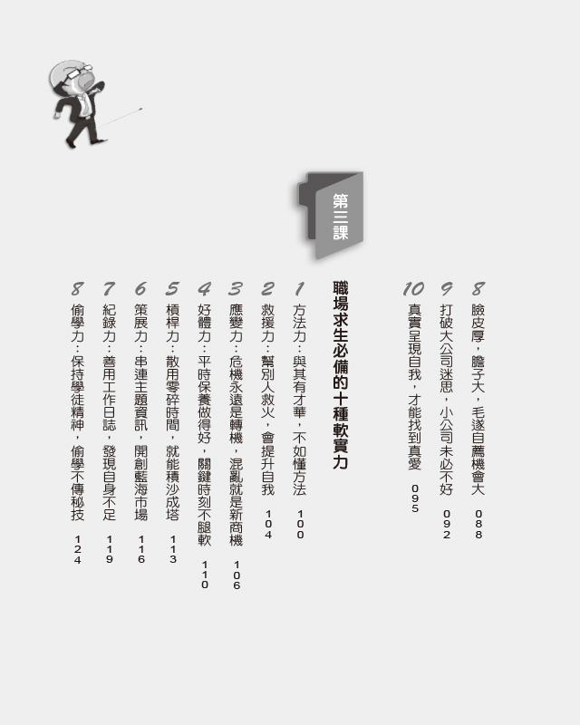 ★ 每一堂課傳授10種超實用職場必備技,總共60種超強技能讓你現學現用。就算是萬箭穿心、不只中了一箭,都能忍住淚水向前衝!