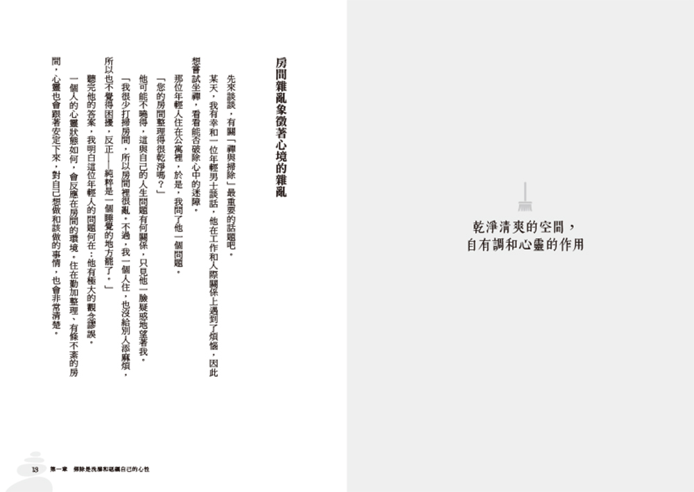日本著名禪學大師枡野俊明,被國民評選為「最受世人尊敬的百大日本人」之一,解說如何透過每天日常的整理、打掃,進而啟發對生活的體悟與靈性的滿足。