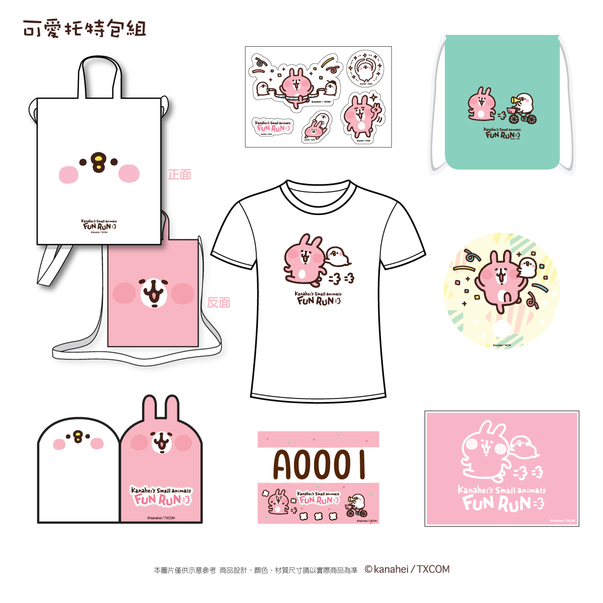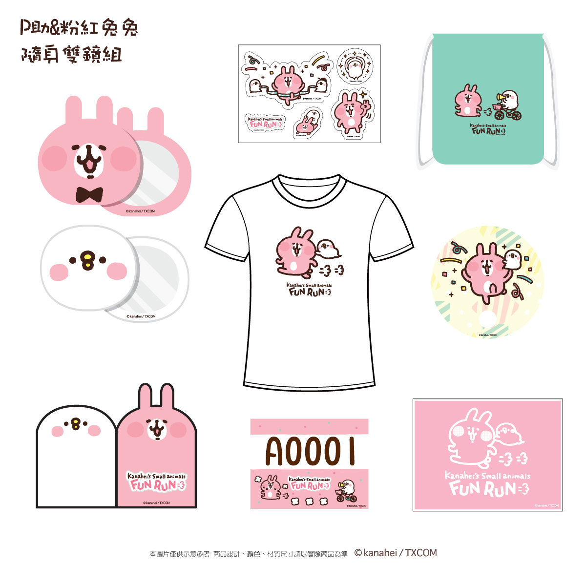 以上每一組裡面還包含獨家設計跑者T恤、束口後背包、粉紅兔兔造型手冊及其他超卡哇伊限定跑者物資。除了跑者福袋,還有路跑限定的加購商品,絕對會讓粉絲少女心大噴發,包含台北場熱賣款商品:P助和粉紅兔兔路跑玩偶、雙拼短襪、運動毛巾,還有全新獨家設計高雄場首次推出的夏日海灘巾和P助&粉紅兔兔伸縮票卡夾。當天出席並完賽的跑者,還能領取到獨家設計款的完賽獎牌以及其他完賽禮品。