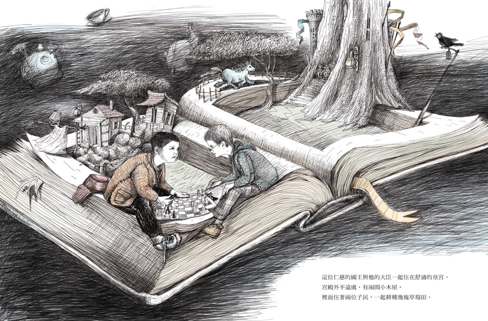 直到某一天,他終於難忍寂寞,泛著淚告訴國王,他決定離開小小王國,去尋找他的朋友。