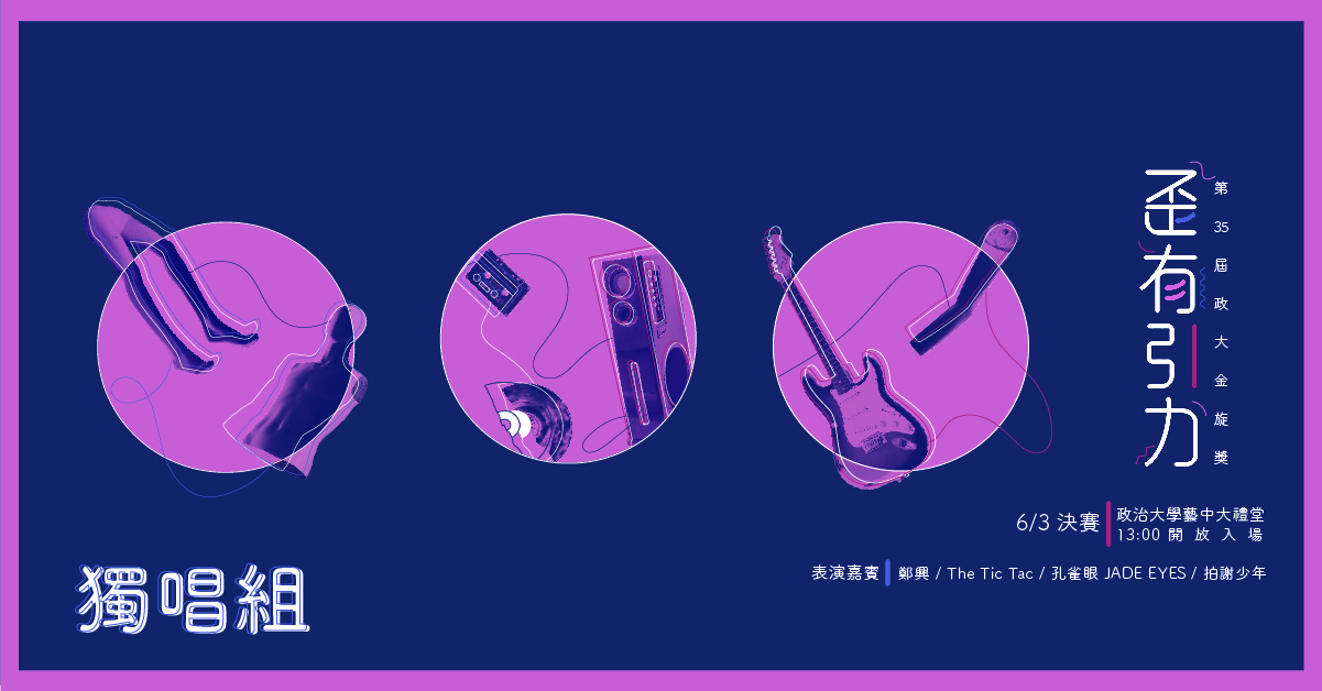 第35屆政大金旋獎決賽,將於6/3(日)於政治大學藝文中心大禮堂舉辦,獨唱組、重對唱組、創作組共26組參賽者,自海選及初賽脫穎而出,將在決賽當天站上耀眼的舞台,唱出自己的歌!