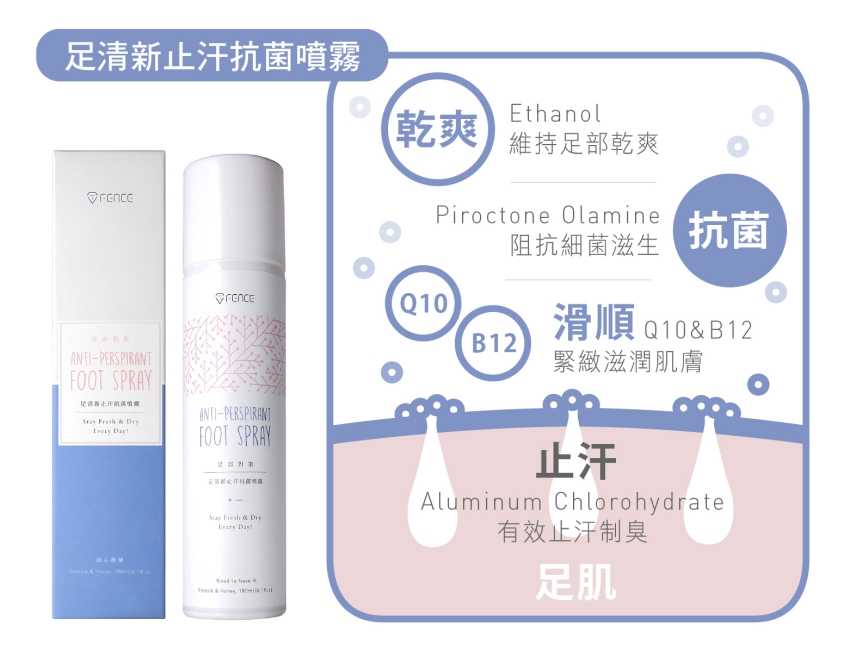 在容易出汗的夏天裡,腳味也越來越簡單就出現。解決問題就要解決它的根源。一切的臭味都是來自於足部因為悶熱而出汗後,造成細菌孳生,進而產生出氣味。因此,讓足部保持乾爽就是最佳的解決方式。防御工事的足清新止汗抗菌噴霧採用有效止汗配方Aluminum Chlorohydrate,能大幅降低雙足過多的汗水、去除粘膩悶臭味,結合Piroctone Olamine抗菌配方,阻抗細菌滋生,效果長效又持久。更添加Q10及維生素B12,同時達到緊緻抗老的呵護效果。止汗同時保養,可以每天安心使用,再也不擔心脫鞋會讓自己陷入窘境!